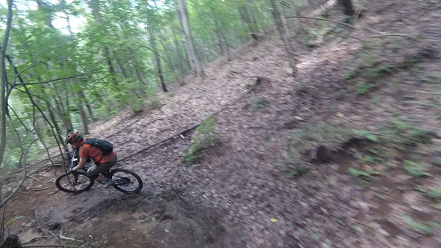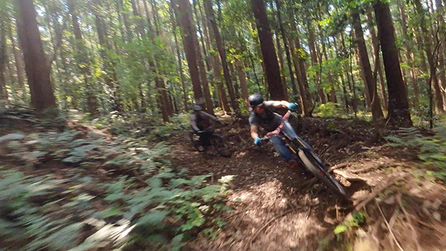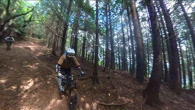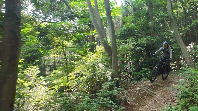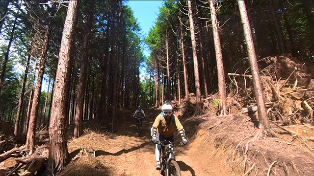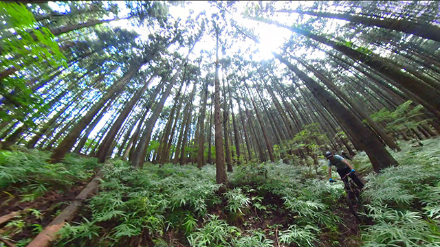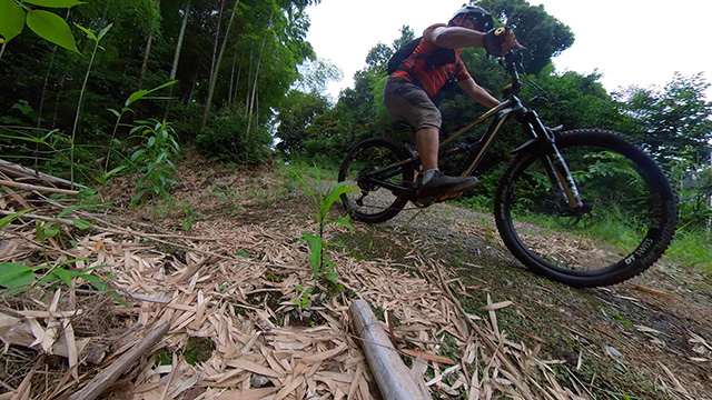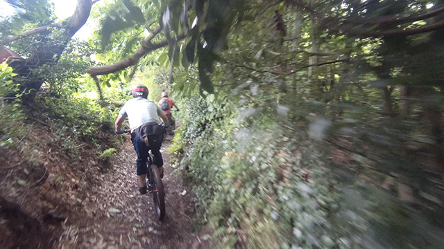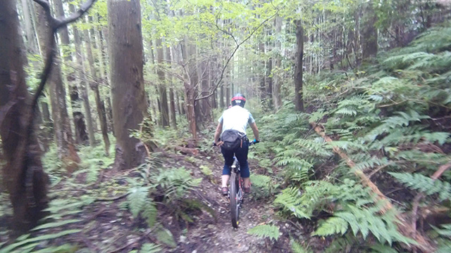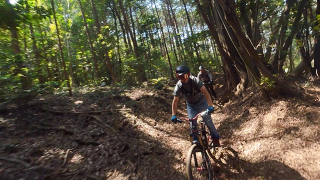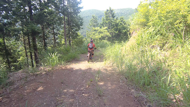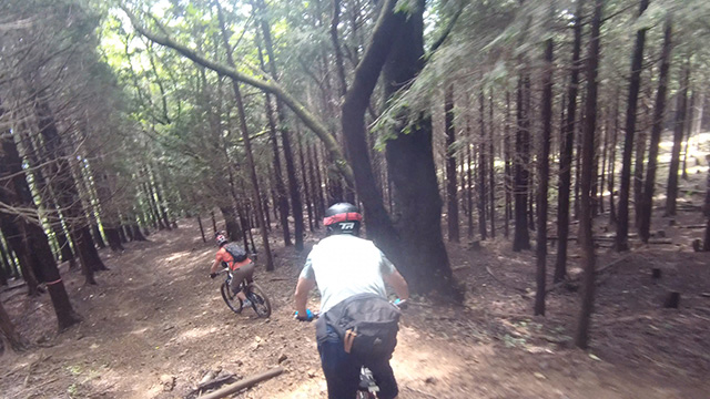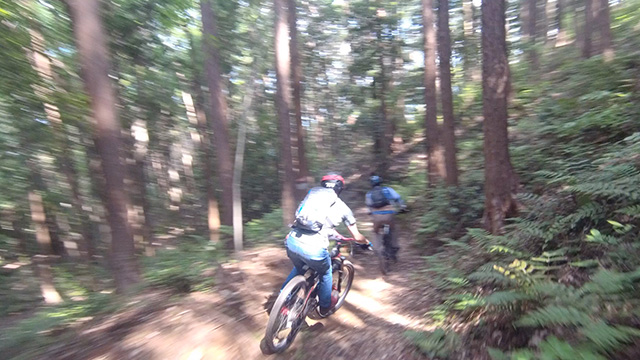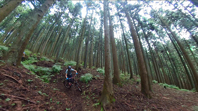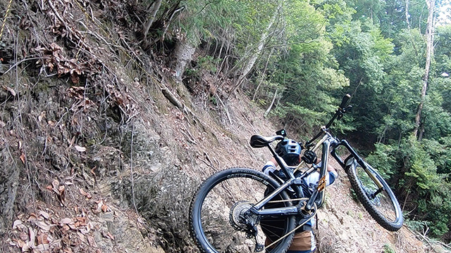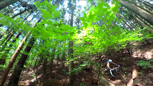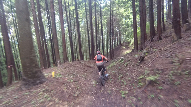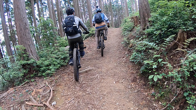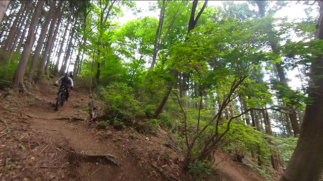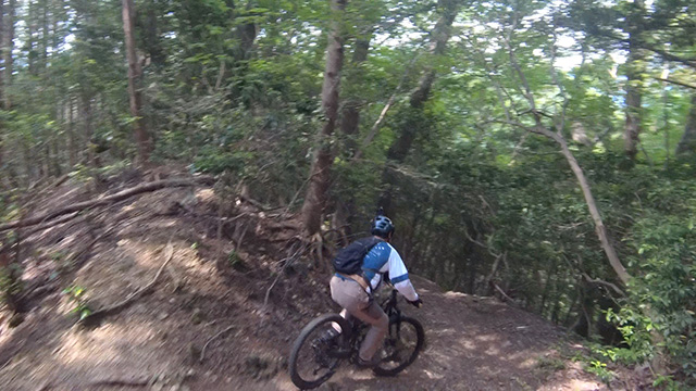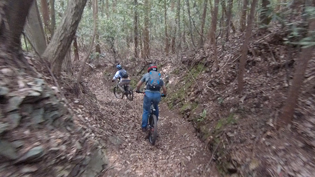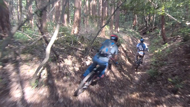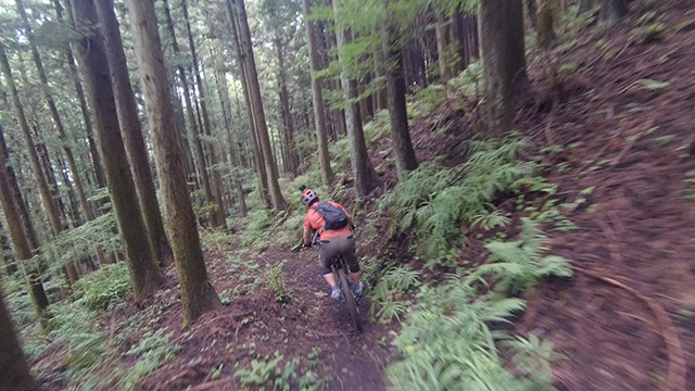 午後は休息地より高度を上げ山頂下峠より南側降下。こちらはマイナーながら3ルートあるうち最速ルートを行く。遮光がなく程々に路面乾き一安心だが、乾ききらぬ根張りでワープしたり驚き笑う。次にはさらに南西の作業道経由の道を巡る。最も明るい道は防火帯のように開け当日一番走りやすくのんびり行くが、黒土大トラバースエリアに突入すれば途端にテクニカルになる。散々身を震わせ締めのロデオ大会は邪心のデトックス効果抜群であった。