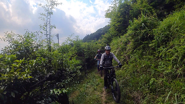 6/12は武州最西部の山系を巡る。この日は4名全てが黒のフルサスというコウモリ集団である。してかつてアウトドア施設のあったエリアよりうる覚えのルートにて北陵に進む。登り返しをいくつも経てトレイル導入まで迷走するがそこからは至福の素晴らしいバーム続きの楽天地である。が、笑みが止まらず調子に乗りすぎたため最終分岐を間違える。撃降り支尾根を突破するようなエラーをおこす。30分も立林を分け作業筋を降った。無事に沢伝いの道へ辿り滝壺淵にて昼食休みとなる。