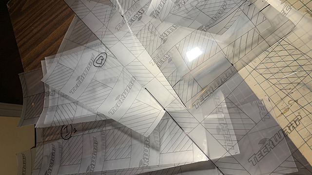 ▲各部サイズに沿ったプロテクトフィルム切り出し。フォーク含め11枚のパターン必要。