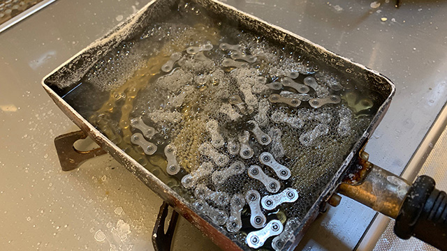 ▲チェーンをイノテックコートするに油脂汚れが酷かった。なので最強脱脂術の重曹湯煮出しを敢行。コーティング後5日間外干しで完了。