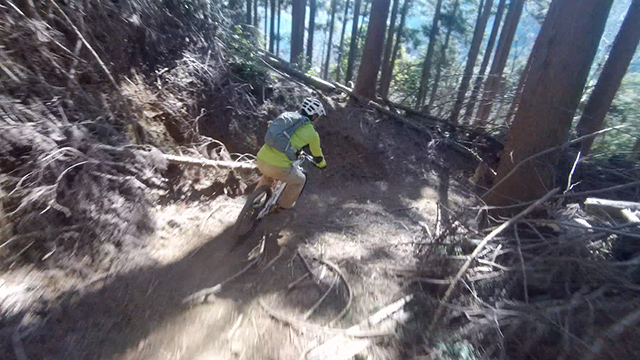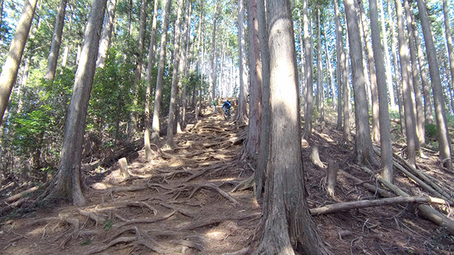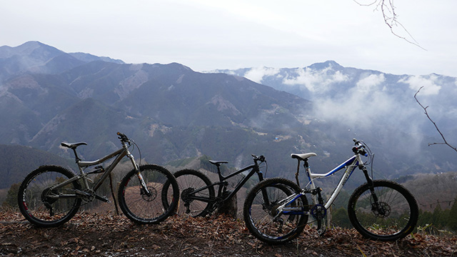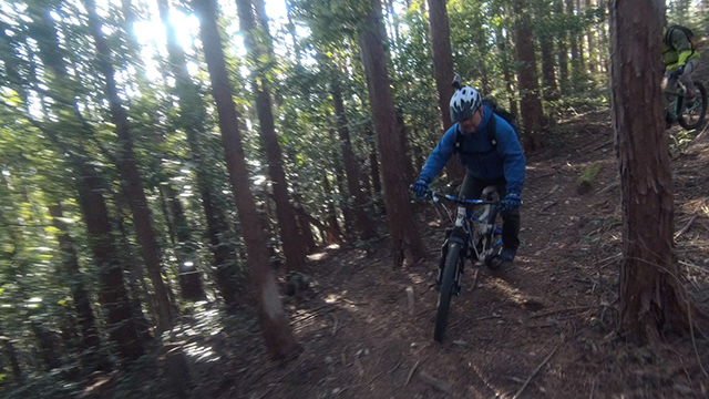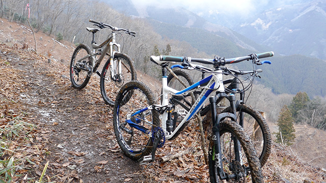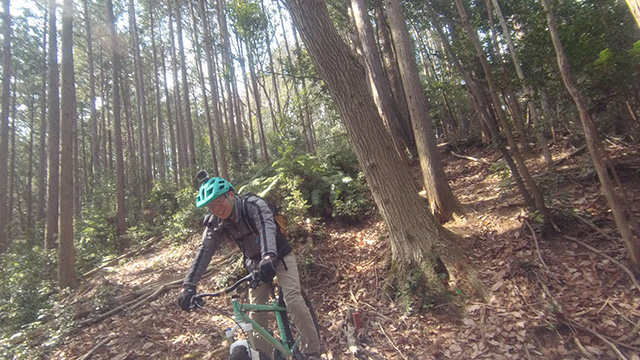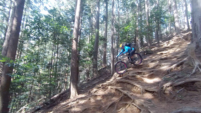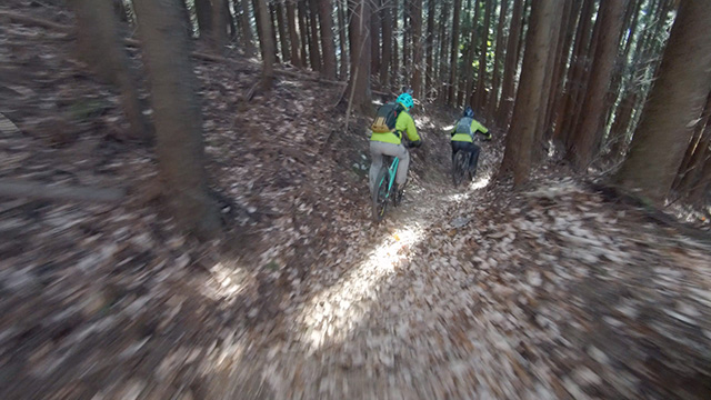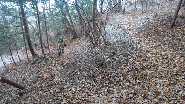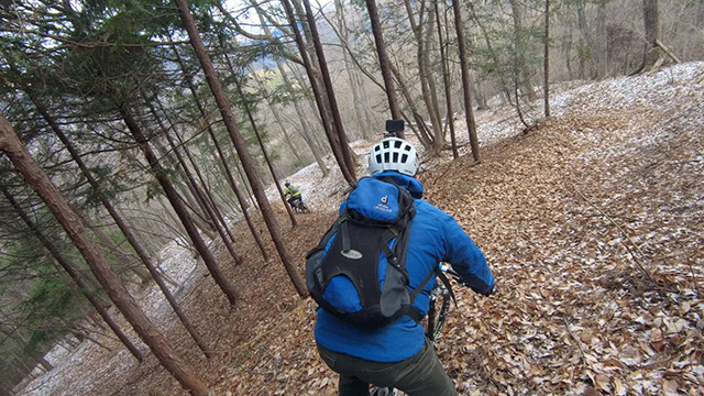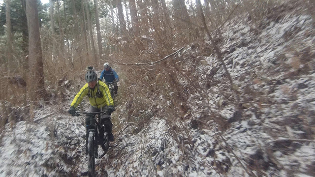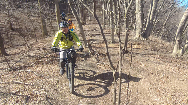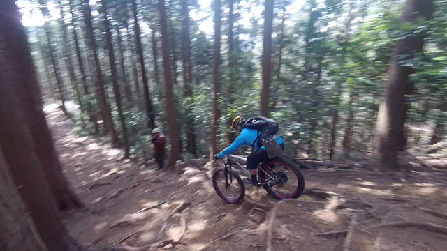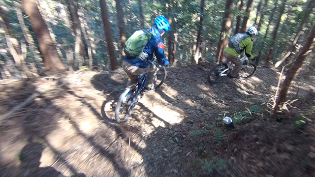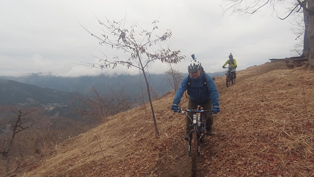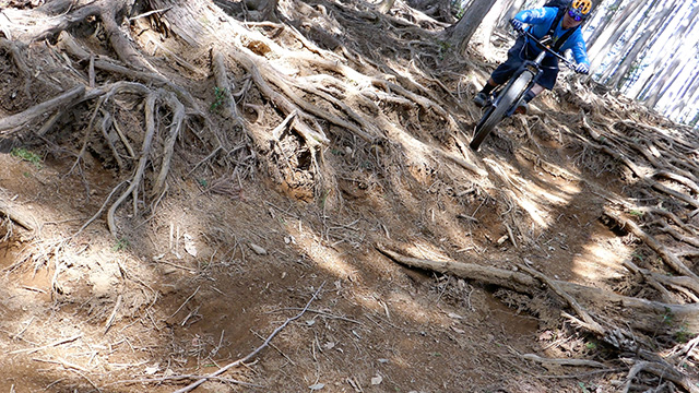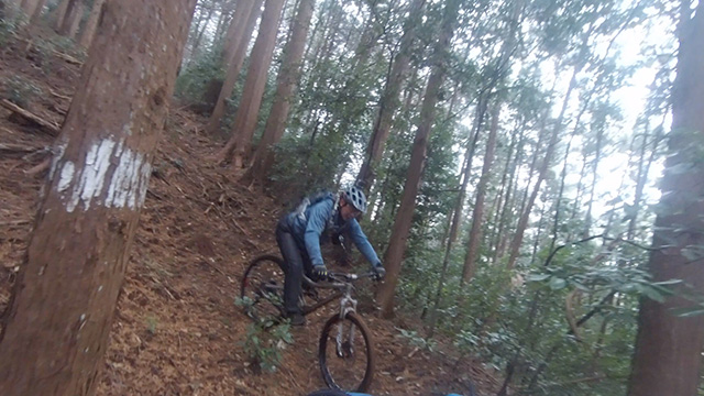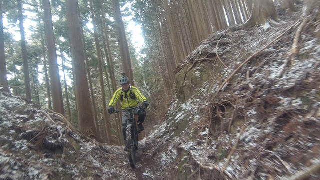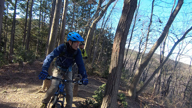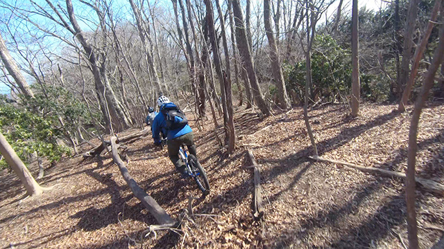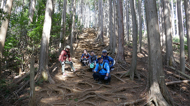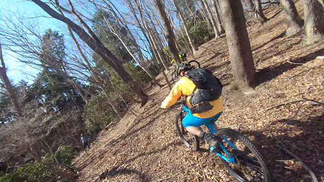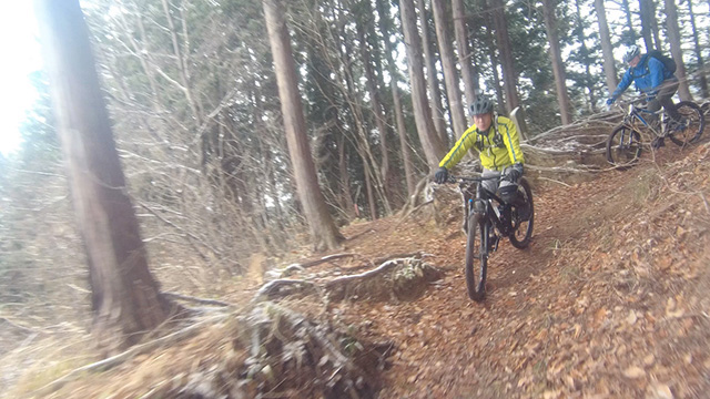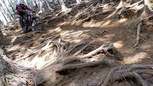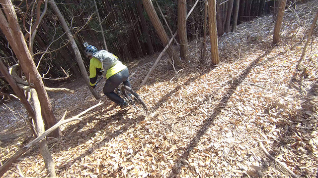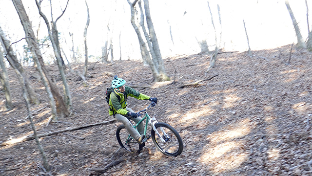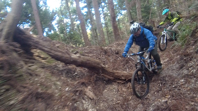 さてヒートしたところで急降下坂のラインどりを皆で模索する。関東山系で最強最長と思われる[地獄の根張り坂]である。上から見るより実際に降りだすと根張り先のボトムが深く驚く。うかつなハンドリングが命取り。下手をすると骨折必至である。しかし皆山バカなのでひるみながらもトライする。自分をたしなめるように怖くも言い訳をブツブツと述べたり、奇声をあげたり。ご苦労なこってで愉快なロデオ・アトラクションである。足つきがあっても誰一人転倒しなかったのは幸いである。