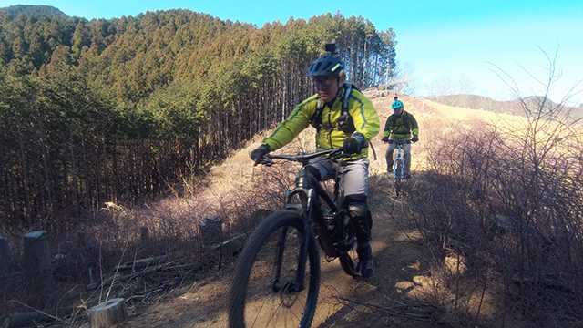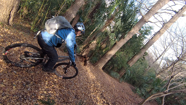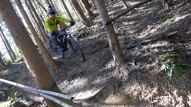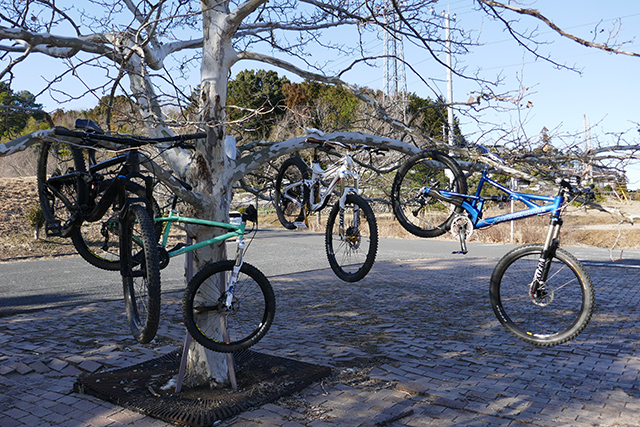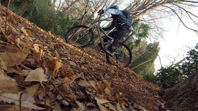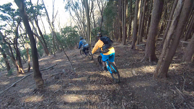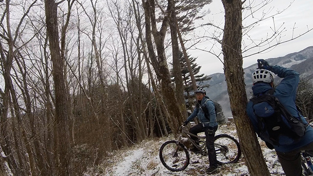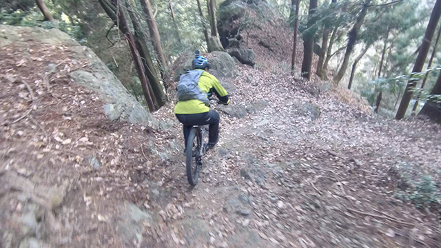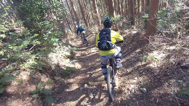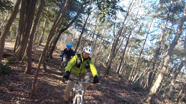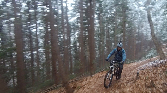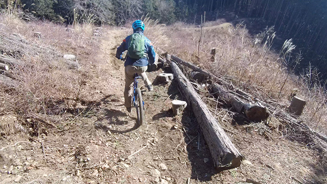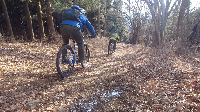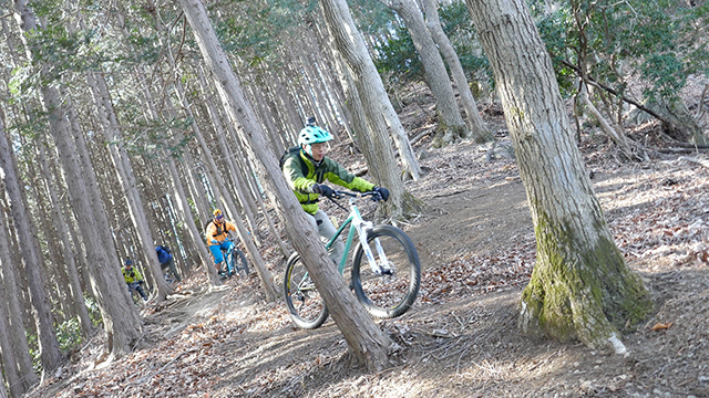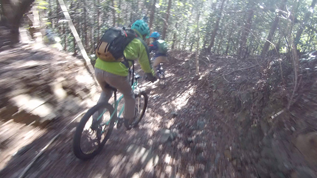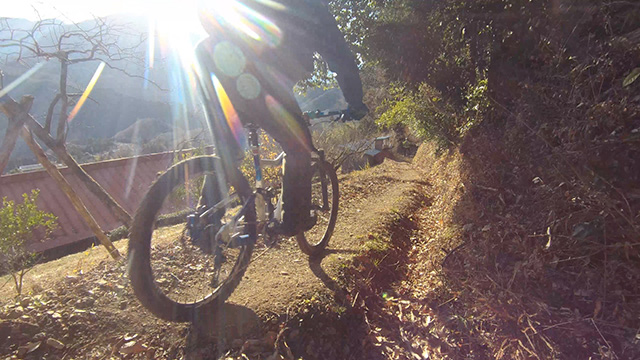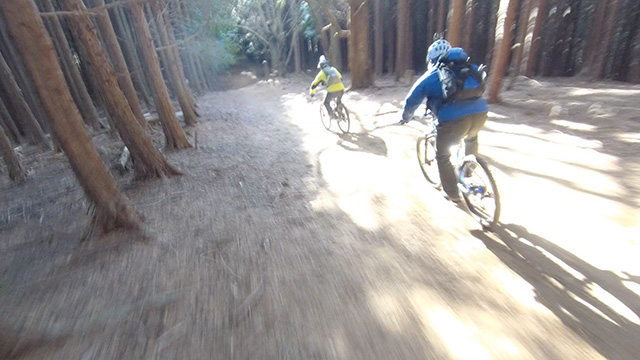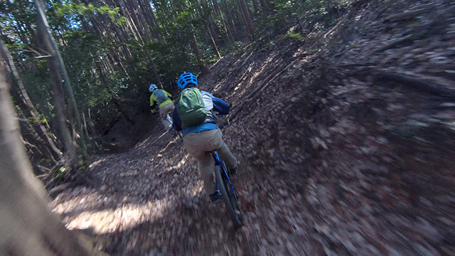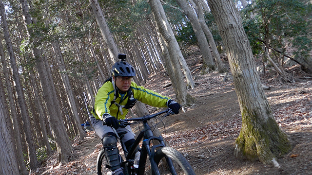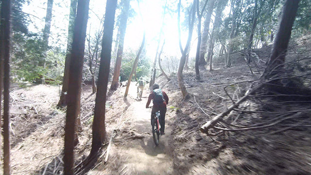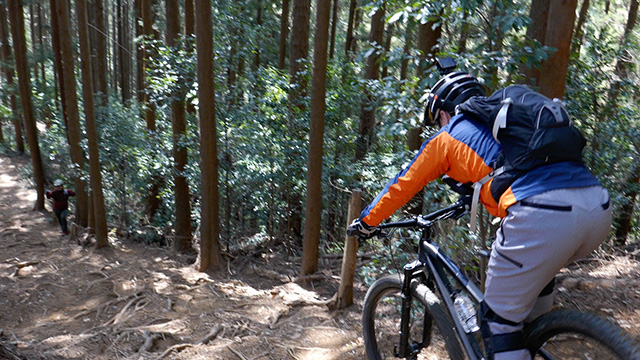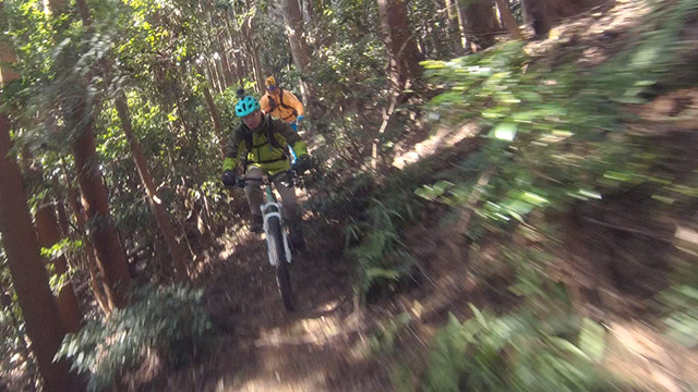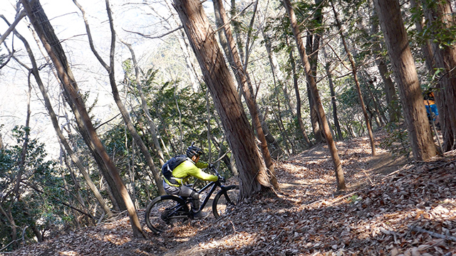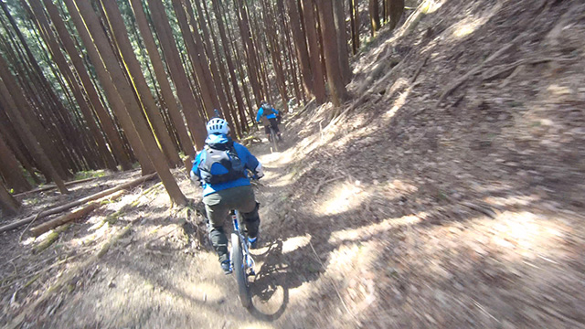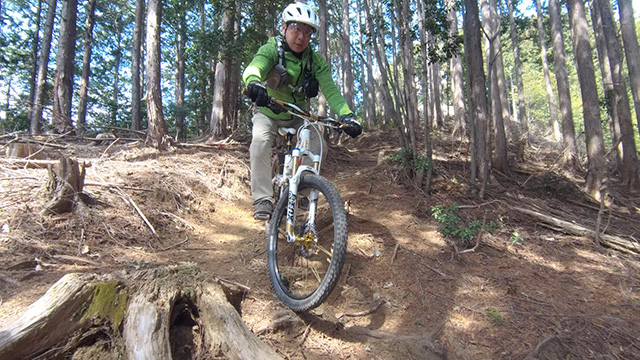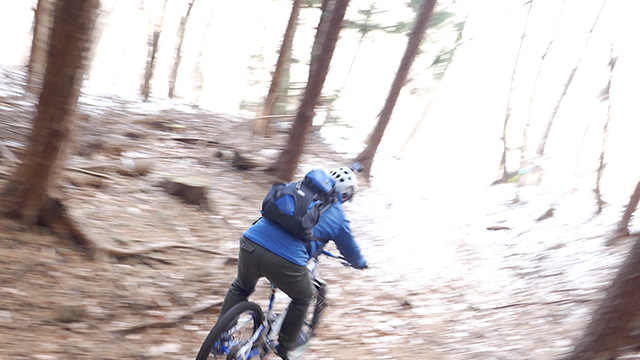 さてヒートしたところで急降下坂のラインどりを皆で模索する。関東山系で最強最長と思われる[地獄の根張り坂]である。上から見るより実際に降りだすと根張り先のボトムが深く驚く。うかつなハンドリングが命取り。下手をすると骨折必至である。しかし皆山バカなのでひるみながらもトライする。自分をたしなめるように怖くも言い訳をブツブツと述べたり、奇声をあげたり。ご苦労なこってで愉快なロデオ・アトラクションである。足つきがあっても誰一人転倒しなかったのは幸いである。