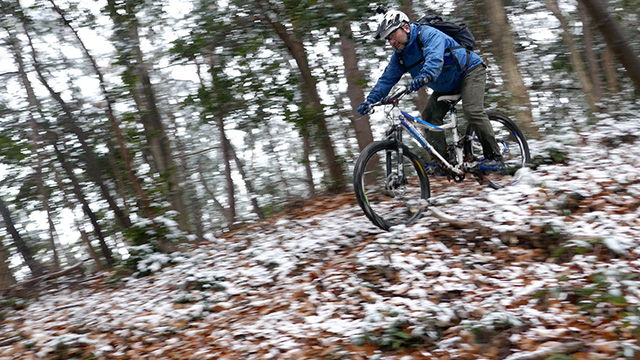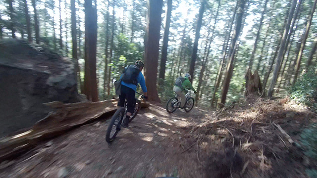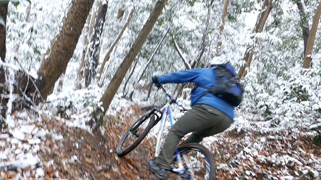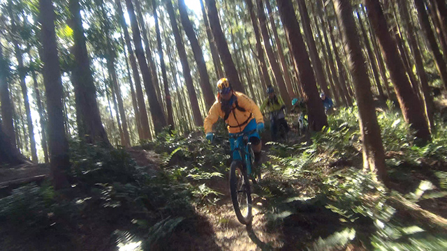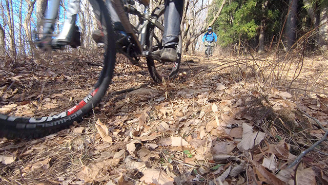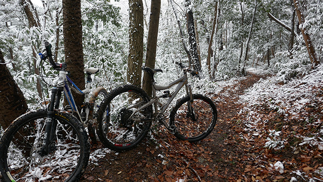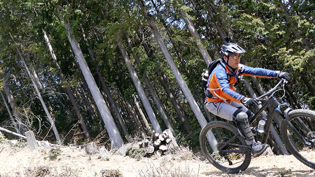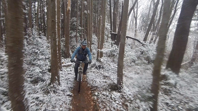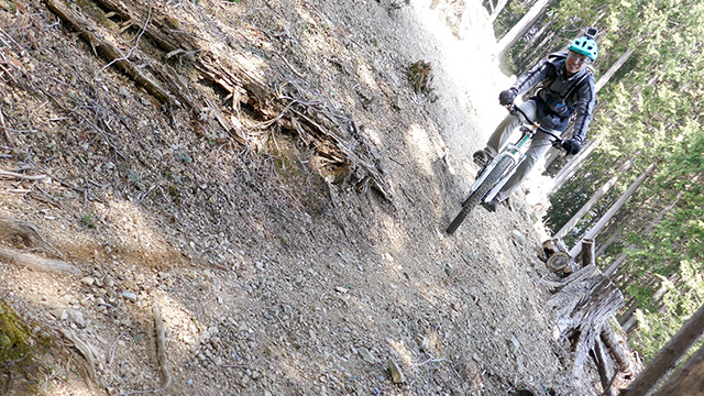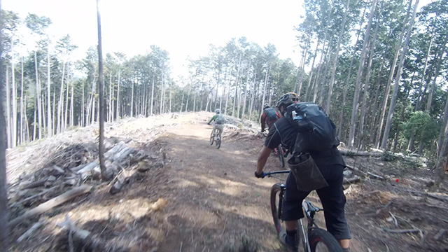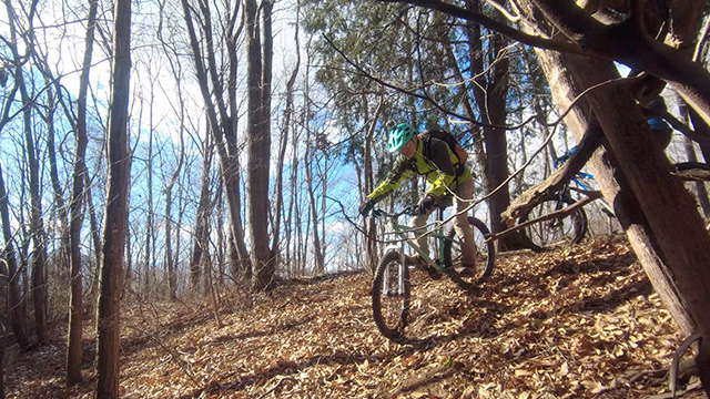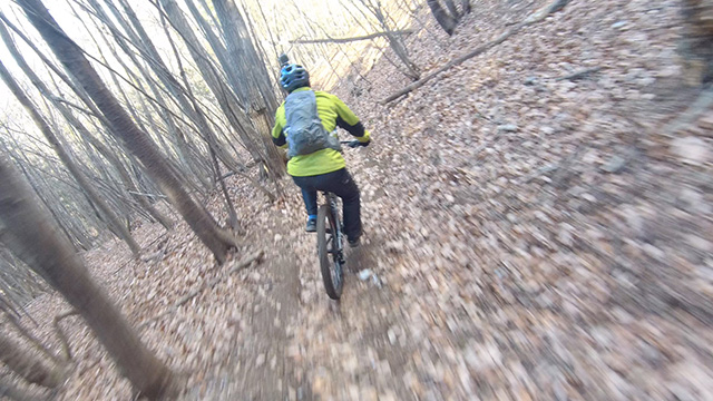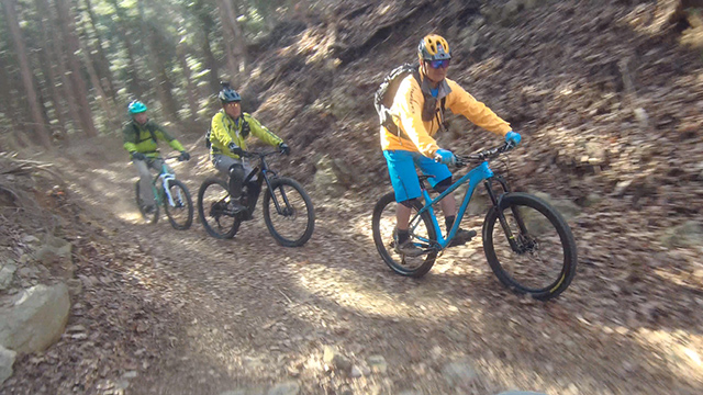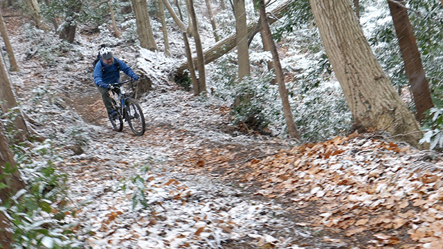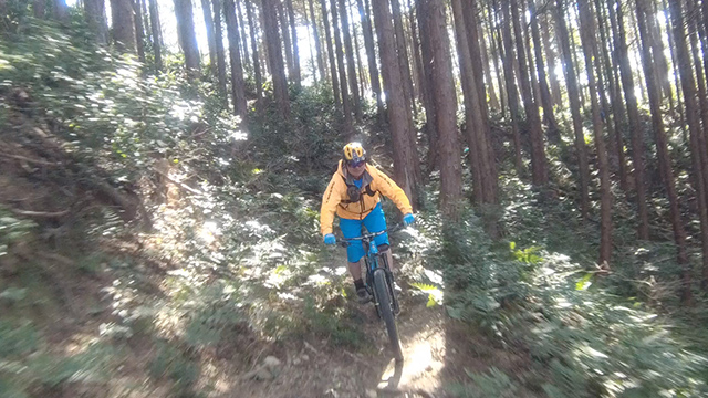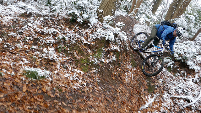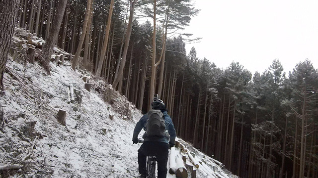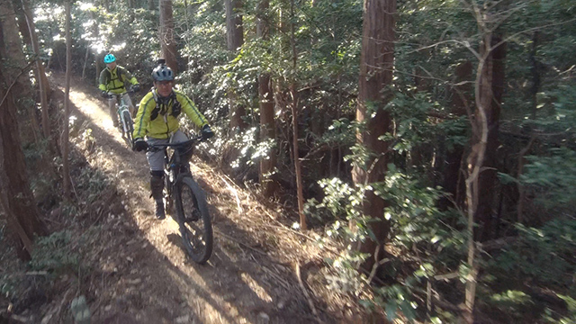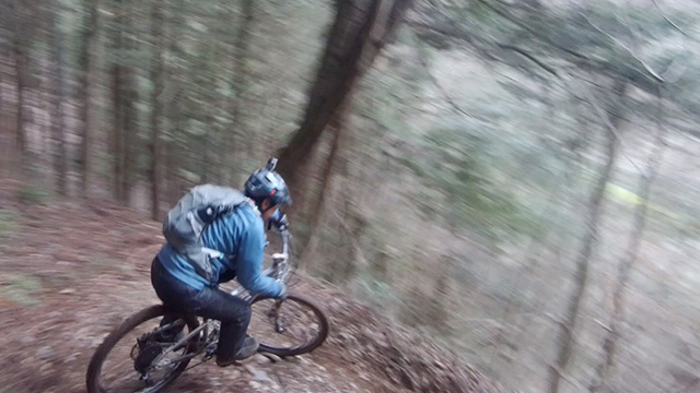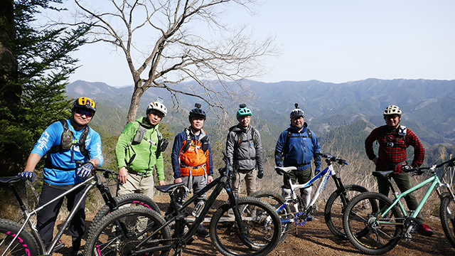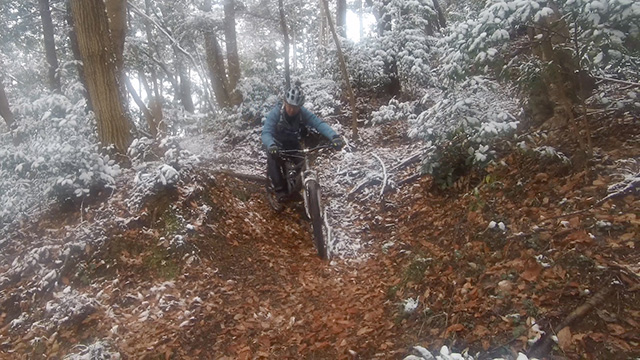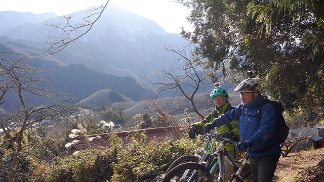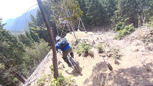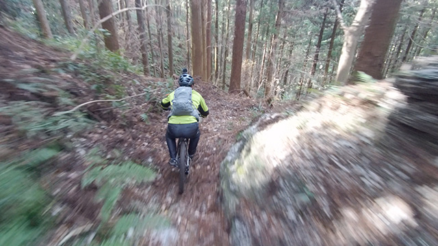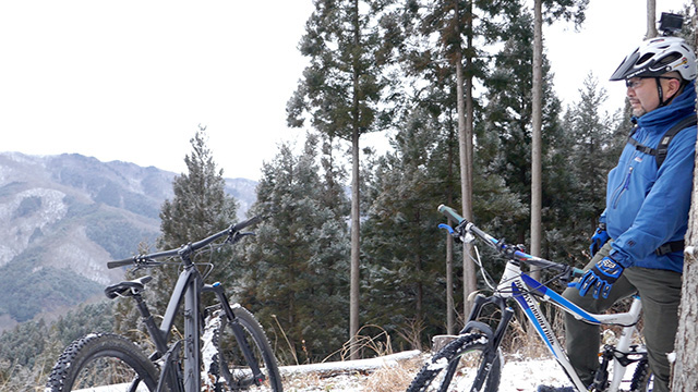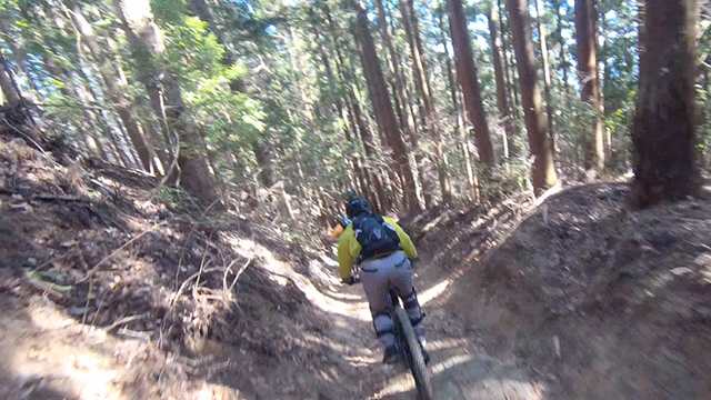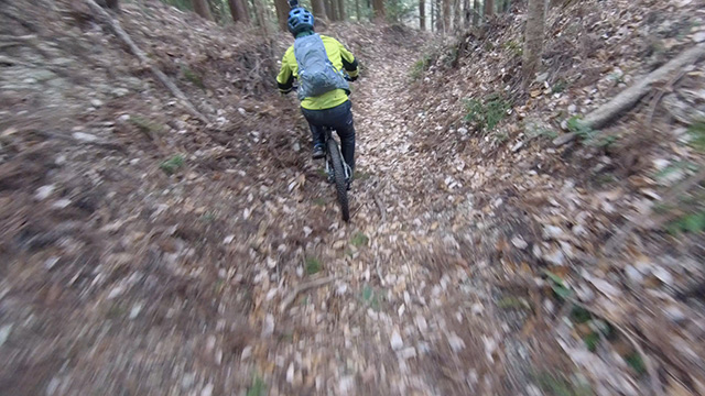 さてヒートしたところで急降下坂のラインどりを皆で模索する。関東山系で最強最長と思われる[地獄の根張り坂]である。上から見るより実際に降りだすと根張り先のボトムが深く驚く。うかつなハンドリングが命取り。下手をすると骨折必至である。しかし皆山バカなのでひるみながらもトライする。自分をたしなめるように怖くも言い訳をブツブツと述べたり、奇声をあげたり。ご苦労なこってで愉快なロデオ・アトラクションである。足つきがあっても誰一人転倒しなかったのは幸いである。