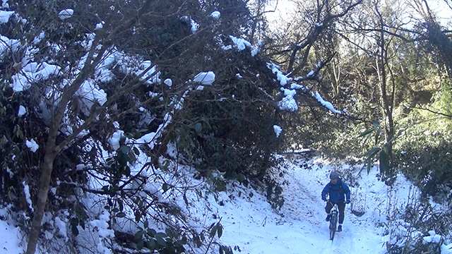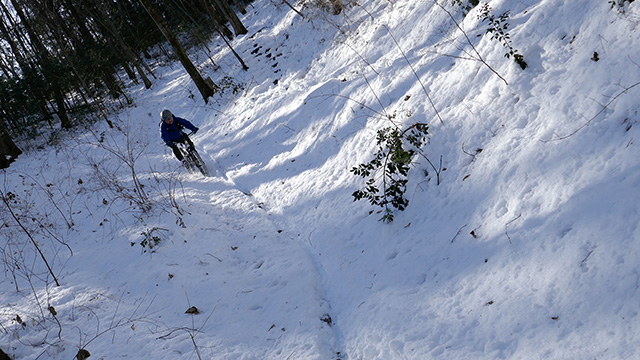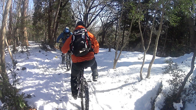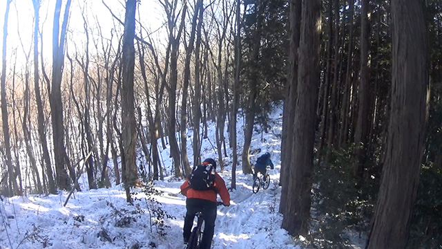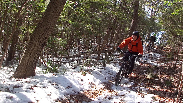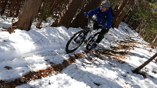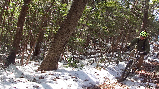 シングルトラックよりも狭いので待ち撮りもままならず、振動が過ぎまたもやヘッドカム角が傾くのだった。しかし勢いよく行くのでプロテクター装着忘れも忘れ夢中でハンドリングするのみ。そして三山目は北方に移動しかつて通い詰めた長大尾根に並行するルートを選ぶ。以前に枝道を谷降りしてしまったリベンジであった。進むうち分岐は多かったがトラバース急傾斜やスラロームまた岩盤降りなど非常にバリエーションが豊かなトレイルだった。その変化に驚きながら愉快に進む。おかげで3ルートとも乗車率ほぼ100%でGWを締め括るにいい思い出が出来たよう。