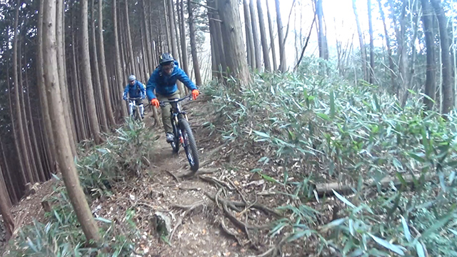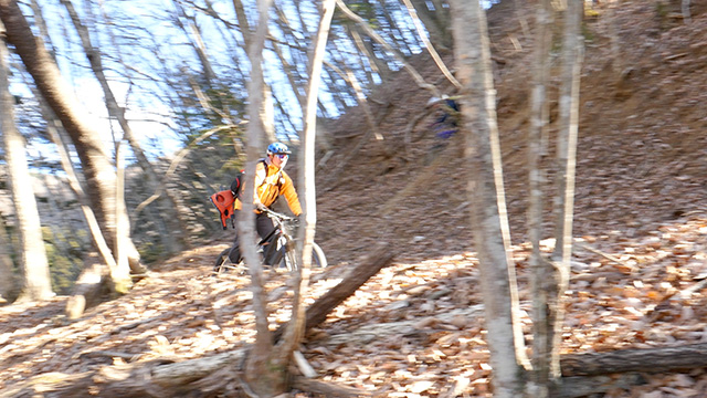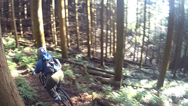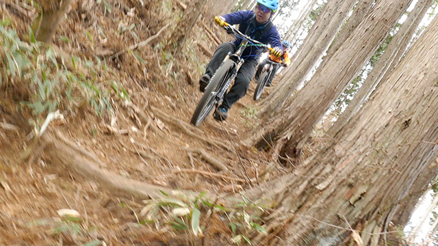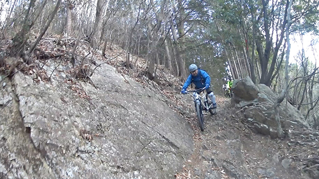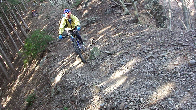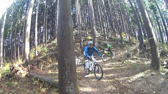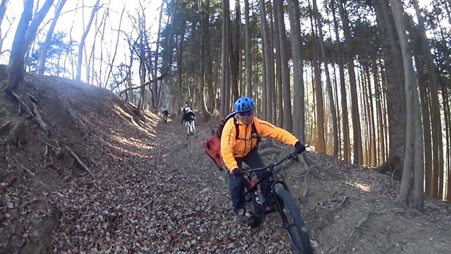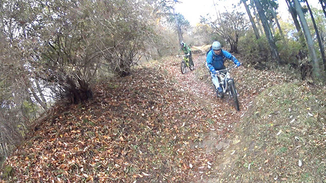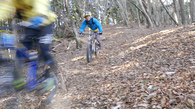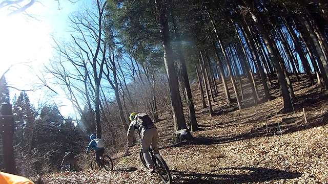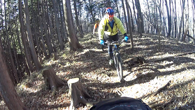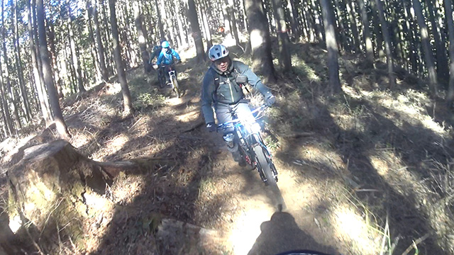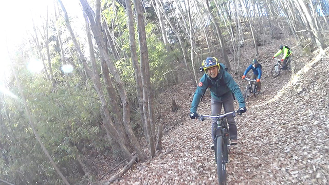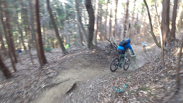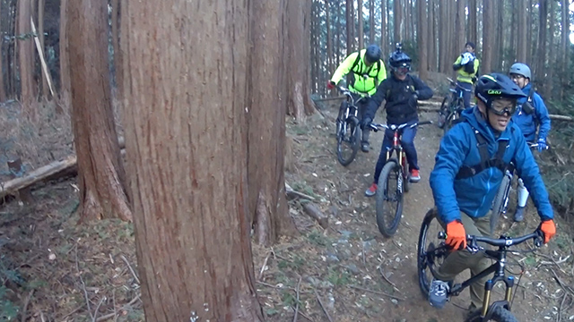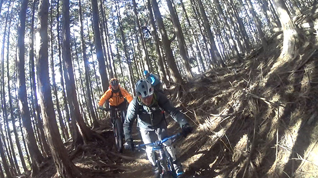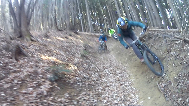 午後の部は表参道で始終快走できる高速トレイルになる。こちらは純粋なシングルトラックで皆勇んで進むので、調子に乗り止まれないのが本音で迎え撮りが不能になる。ピーク気温3度で寒かったに関わらず中盤以降は皆デッドヒートである。あれだけ急いで皆よく転倒しなかったものだが、当方自身が終盤V字ドロップで岩盤に突進横転する始末。あぁ所詮先導は危険箇所へのテスト要員なのだなぁ。