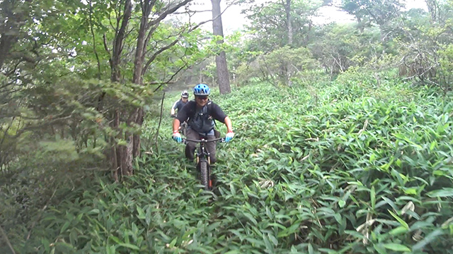 前回北関東・雄大トレイルを7/22は当山お初4名をご案内ツアーとなる。午前中第1ルートは分岐がいくつもあるが、なんとか前回ログ頼りで進行できた。しかしたったの一ヶ月前より足元の熊笹・薮茂りは4割増しになりその険しさに驚く。特に下方はその群生が激しく行く手の心配をさせるもの。足元が見えない深薮で先導当方が見えないドロップより落とされ巴投げを食らう。また「獣と遭遇したらどうしよう…」などと思ううち本当に鹿の親子が眼前を横切った。前回は見通し良く快適だったのに植生が変わると修験道になる。まあこんな事が季節ごとに巡るトレイルツアーの醍醐味かもしれない。