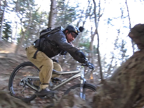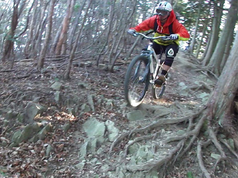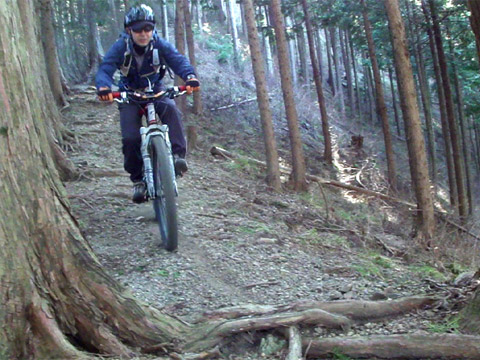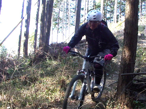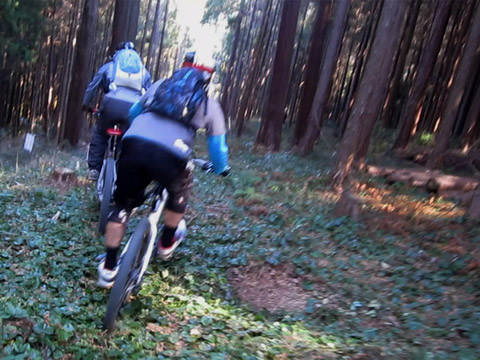 行く手に苦行も覚悟したのだがその危惧は無用。道を掻き分けるわけでも無く作業道は繋がっていた。あっけなく開け現れるルートに皆ブチ切れて止まらない。それは待受け撮影を誰もがさぼるほどの勢い。そのスタイルは[ふじてんゲレンデDH]の様なスピードループ状の快適トレイルだった。この機会での見渡しの良さは冬枯れのお陰だろう。春夏ならば藪で導入も不明だったに違いない。久しくの開拓ルート大当りに自分が腰痛だったことも忘れ機運が上がる事を喜んだ。