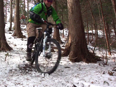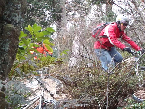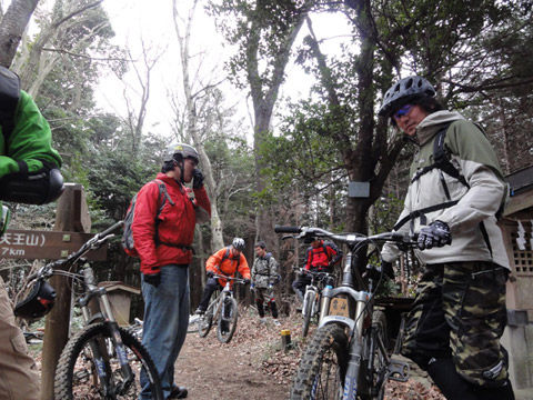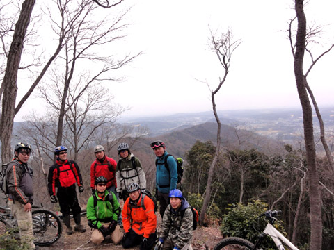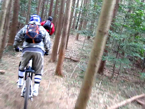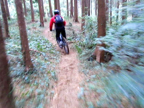 最終目的山へ登頂する頃はもう15時を過ぎ、夕暮れ進行を覚悟。昇りに激傾斜の担ぎ上げをする。皆に体力消耗させたが先急ぐゆえ登頂後まもなく降下開始する。始めて巡るこの道は思いのほか林間開け美しい径路だった。緩やかなカーブを幾つも経てMTBのラウンドリズムに合う素晴らしいトレイルだと感心した。
