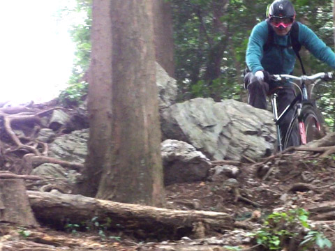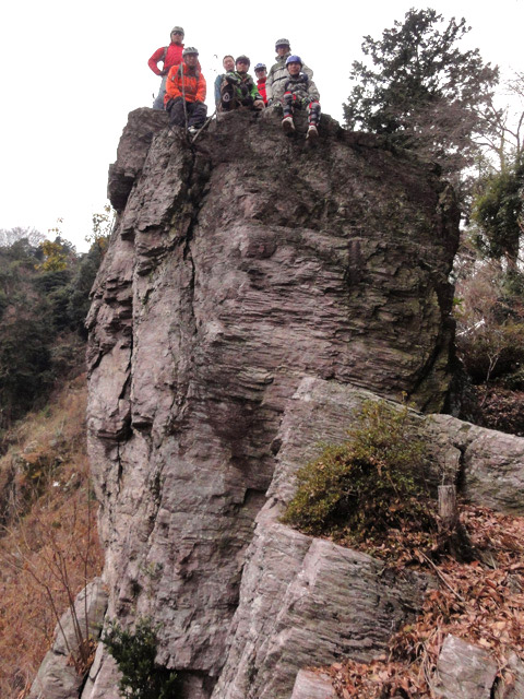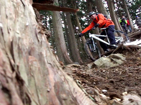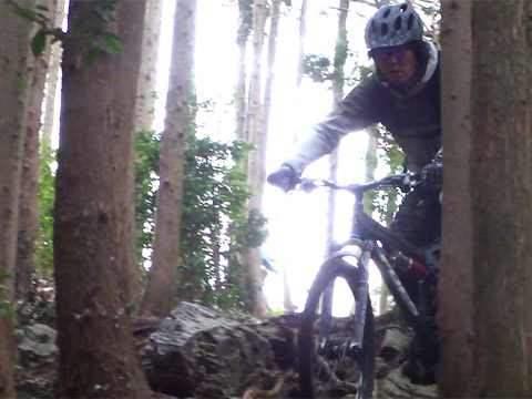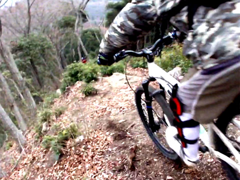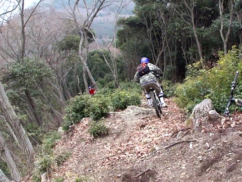 岩上は高所恐怖症だと足がすくむほど高かったが、皆を岩盤に召しまつり山行安全をまとめて祈祷したというわけである。以降アタック箇所での恐怖心を克服するには効果であったろう。おかげで後の難解激坂アトラクションを楽しめた。連続降下では落葉が増し路面ギャップに慌てたものだが順調に進み五山目も無事降下達成。
