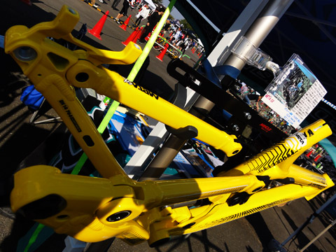 カテゴリー比率ではXC〜オールマウンテン系フルサスが多く各車リンク機構の工夫が見る目を楽しませる物だった。パーツ系ではCrank Brothers Cobalt Carbonホイルが目新しく、自身の使うアルミCobaltより3倍価格の30万円以上。重量はなんとペアで1380gしかなくタイヤより軽いのである。パーツ・ウェア等のアウトレット会場は来場者でごった返し入り込めなかったが、メインの車両展示は充分に触れ楽しめた。