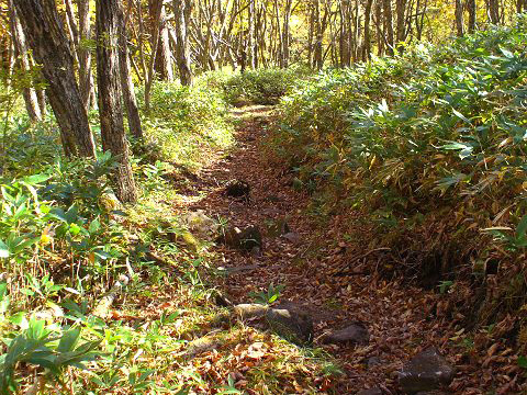 雄大なトラバースでは落葉下の岩地雷に度々驚く。そしてグリップを探りながらもハシャギ駆ける。しかし度胸一発ナイフリッジではJシリーズDH選手D氏でさえ滑落自爆してしまう。なので縦走行程がまだ長くあり皆に超アタック禁止令を発令する。全員初山ながらこの初盤二山を活気高揚させ午前の部を消化した。