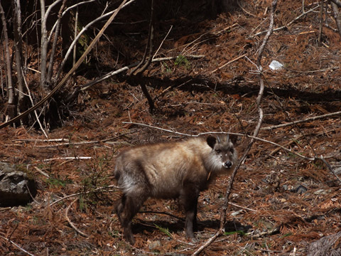 我ら8名は飯能北部1100m弱の頂き目指し勇壮に進む。中腹林道沿いにはやけに太った鹿がこちらを覗くので近づいてみれば、なんと珍しいカモシカであった。皆感激しては立ちすくむその姿に見とれたようだった。さい先が良いものだ。と思ったのも束の間だった。頑張って皆 で登頂したは良いがその後が大変。