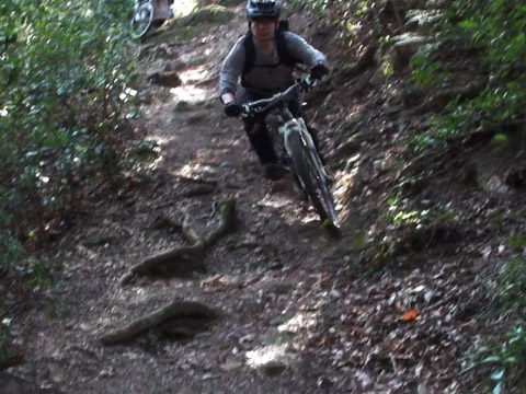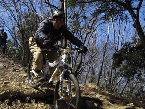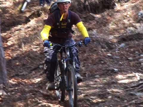 ピーク直下からの岩盤アタック降下でリアサスバルブがヒットしたことに気付かずリアダイブ状態でケーブルも引きづる状態に陥る。挙げ句の果てにはスイングアームばたつきでブレーキキャリパー固定ボルトが外れ制動不能になった。まあ直すことができ以降は皆のアタック撮影に専念する。