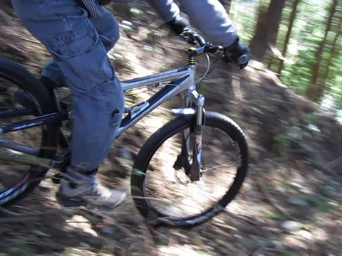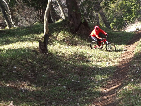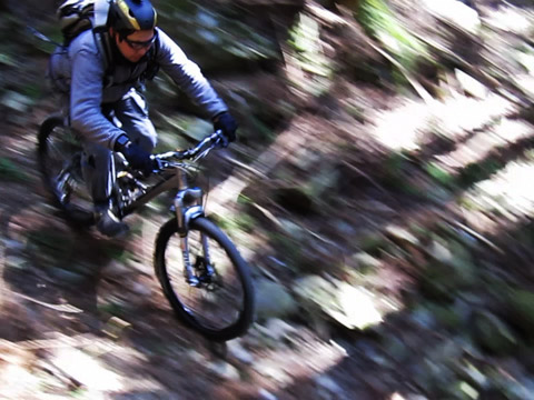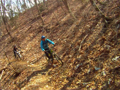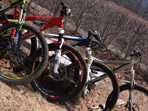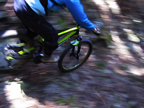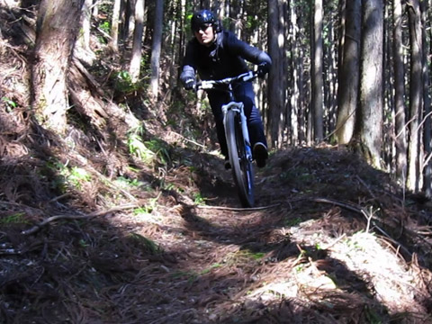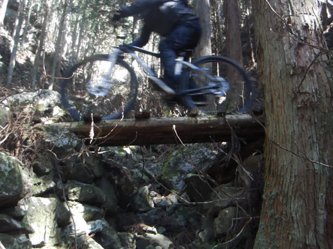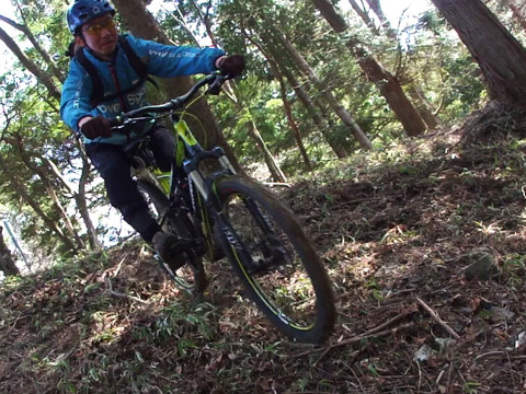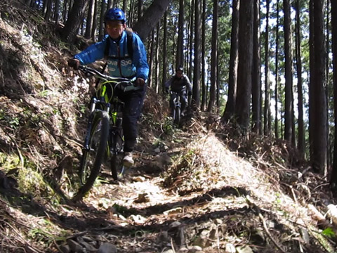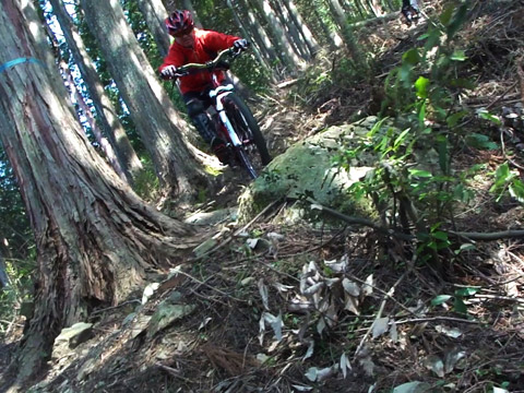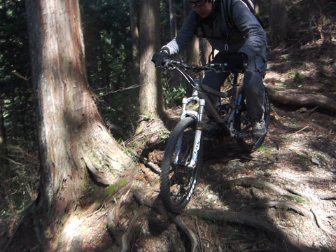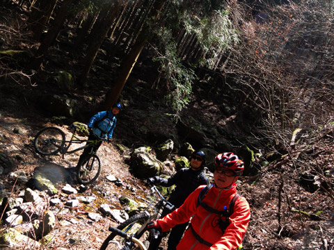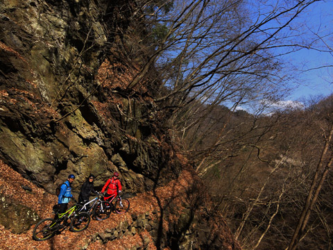 前半デンジャー巻道に慣れる頃道も広がり、そして大岩盤地帯に向かう。高さ50mくらいの一枚岩が屏風のように連なり道程のワイルドさを醸し出す。我らは冒険家的気分になり乗れなくてもなぜか充実感を味わう。こんな修験道的光景は珍しいので初入山貴兄は圧倒されたであろう。そしていよいよ後半は乗車率も高くまた上級障害物走になって行き者どもはしゃぎ出す。