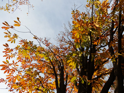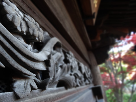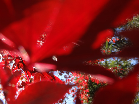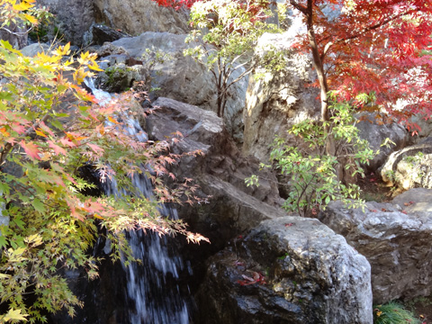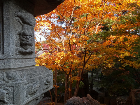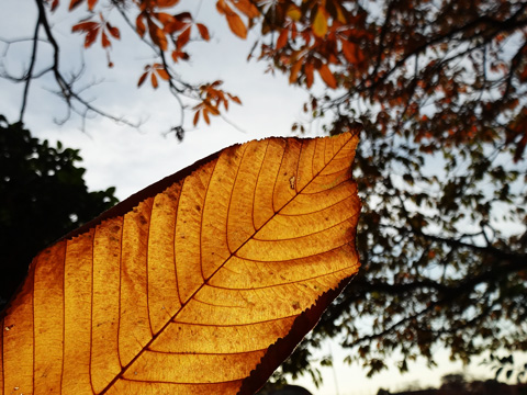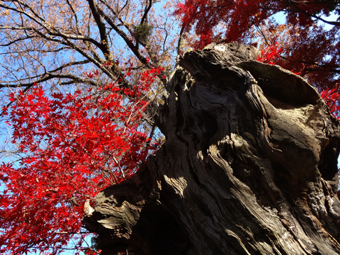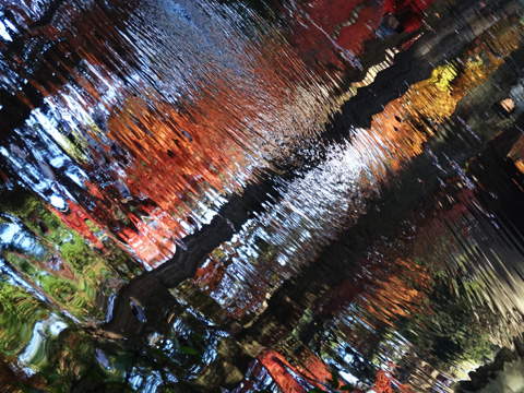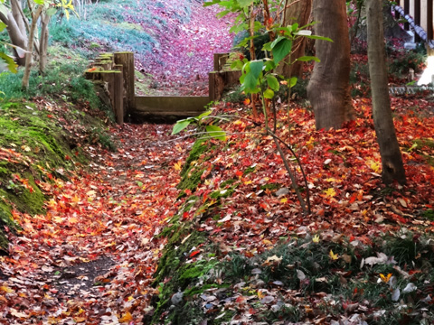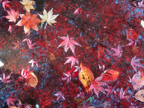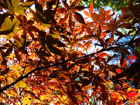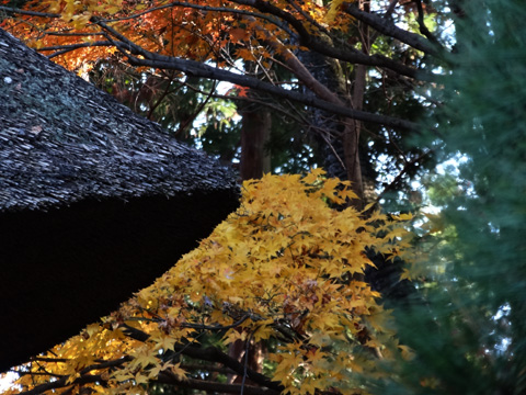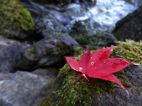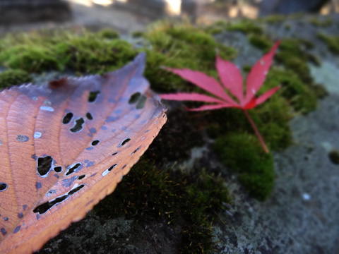 昨山行予定11/23は雨天中止で鬱憤補填とし翌日自宅より西方の天鳳山禅寺に向かった。ここは武蔵野の面影を残す貴重な自然に恵まれる。俗世間との境界を示す山門を抜けると伽藍収まる境内が開け紅葉の鮮やかさ際立つ。その核心地は紅葉狩カメラマン様多勢が陣取り高級カメラを駆使していた。密集で立ち位置譲り合う場は避け自分は地味な奥地へ。境内の奥丘陵に登り詰めればひと気も疎ら。常緑樹に混じり密やかに紅金色に染まる枝葉を追う。残照に映える葉脈、そして滝しぶきを浴び濡れたる様など見ては境遇の差に関心を向ける。多勢が気付かぬ個性的構図は無いものか?と「我れ往く果てを知らず」また奥へと徘徊するのであった。