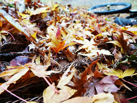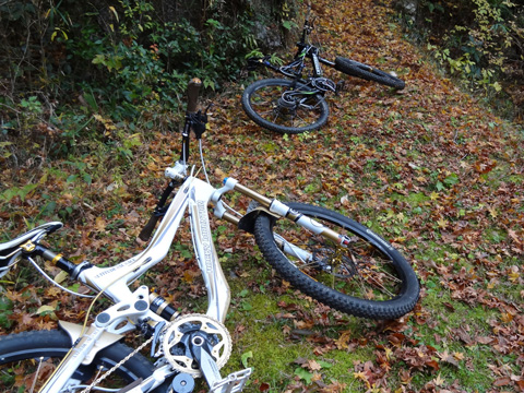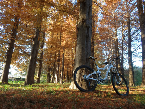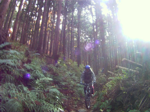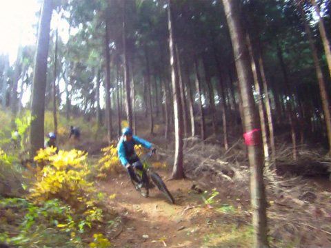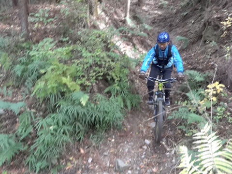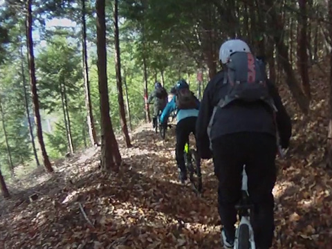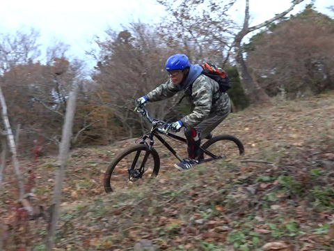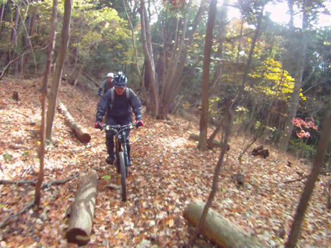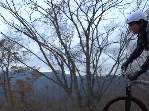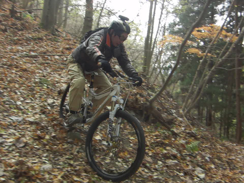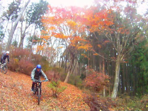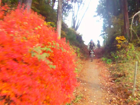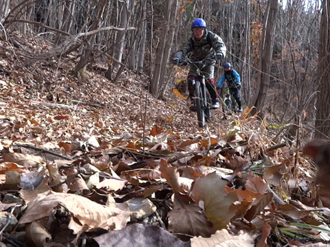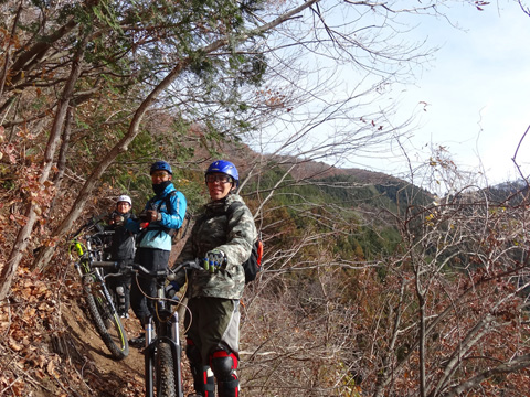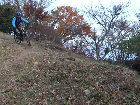 12/2(日)は5名で横瀬・正丸方面の二山に出向く。この日は寒気にて900m級ピークは0度と凍える。複数ルートのうち日当りの良い南側巻道ルートを選び進行した。谷側木立は葉がないためオフキャンバー下が丸見えでスリルもある。陽光注ぎ体を動かせば賢明さに従い寒さは感じず。あらたに参加してくれたSZ君もMTBビギナーながら快調に駆ける。さすがオートバイ乗り動体視力は優れたもの。落葉を踏みしめ歓びを噛みしめ順調に進む。しかし行く手に落石も増えいきなりの岩盤に驚きズッコケ野郎も現わる。午前径路全般は路面状況良好なトレイルだった。午前山系から続く長大尾根上経由で午後は東へ5km移動していく。