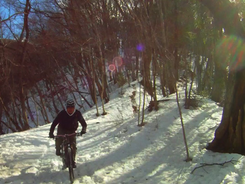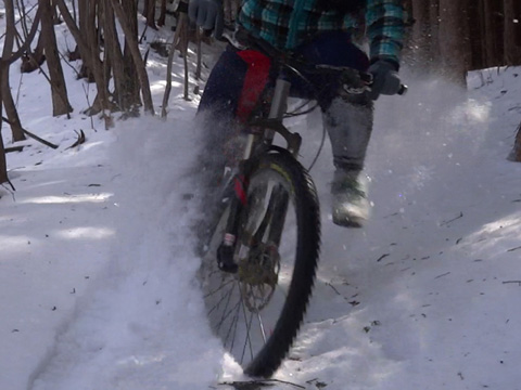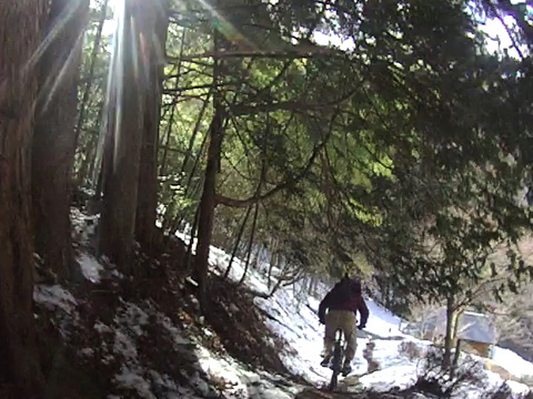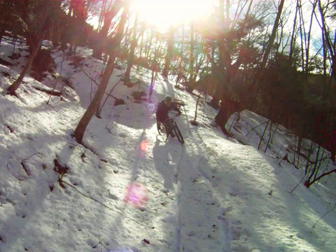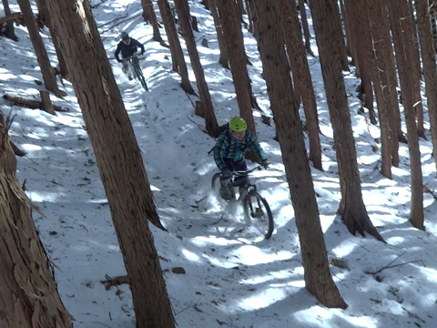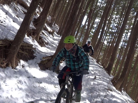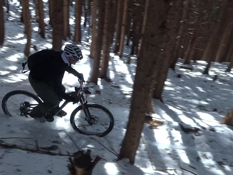 進むうち雪に埋まり前輪揺らす我が姿見て皆がおかしいと言うのだが、そんな後者はつけた轍に沿えず慌て駆ける。当惑し寒さも忘れバームに突進したりコーナー外に落ちたり。何度も弾け積雪クッションに委ねるように飛ぶのだった。また起きては賢明にペダルを漕ぎ回すが普段豪速で往けるトレイルなのに散々回転させないと進まず呆れた。あと5cm積雪厚ければ降参だったろう。思いのほか残雪が多いのでこのエリアは当分走れ無いかもしれない。通常の3倍位パワーを使い駆け巡る雪道では修行のように無心になる。かくもこの状況を選んで来れないので貴重な体験か。麓に着けば周囲の雪景色に励まされるような快活な心持ちになれた。