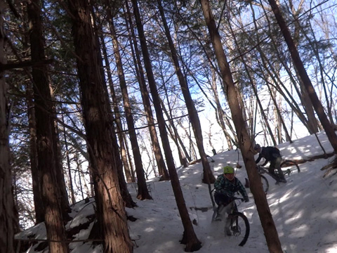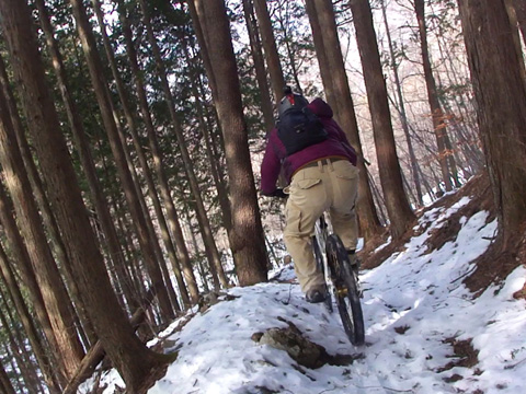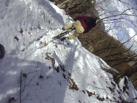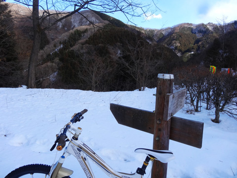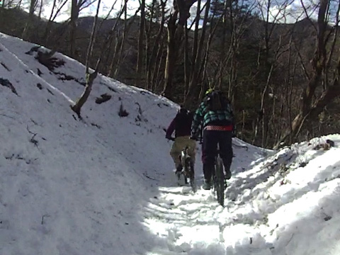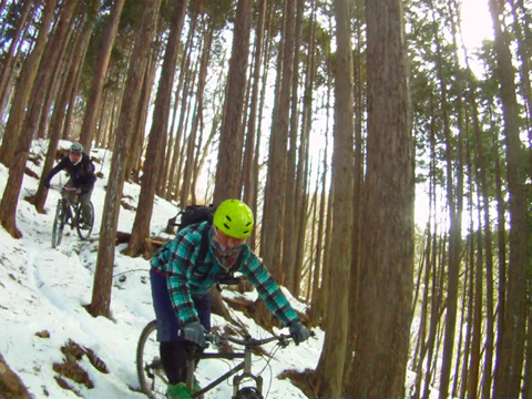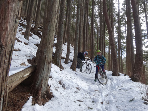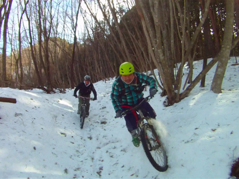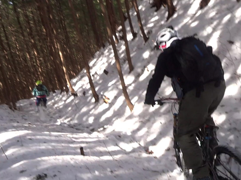 1/26(土)奥多摩1300m級未知の山を開拓するために1000m位登ったはいいが、這い上がる登山口以外のMTBを押上げ可能ルートは氷結し先も凍えるようだった。やむなく導入確認だけにし近隣山に向かう。よもや山上の状況確認は現地まで判断出来ぬものと学習。せっかく遠方より参上YZ氏のためにも当山系で挽回と馴染みの尾根を目指す。往けそうなトレイルなはずが積雪多く峠口を塞いでいた。代案で別の導入巻道で担ぐも吹雪くオフキャンバーで煽られながら1150mピークまで着けた。降下していく九十九折の未踏の新雪は思いのほか厚い。勢いつけないと埋まる程だった。まあどうにか漕げる程度で久しぶりの雪上滑走となる。