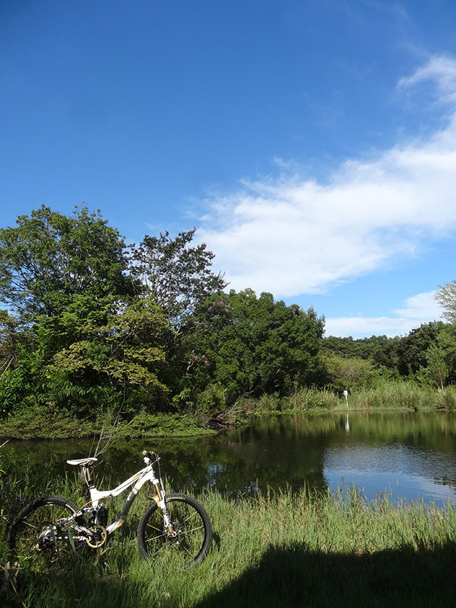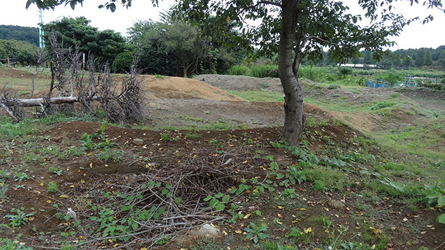 そこから北方に忘却パンプトラックがあるのでそちらへ移動。ローカル愛好方が丹精込めたこの幻パークは雑草まみれ倒木もありですっかり廃れていた。それはまるで考古学における遺跡発掘現場の有様。しかし道筋ははなんとか読めるので落ち枝や雑草を蹴散らしだるいフルサスマシンでえっさこら巡る。ローラーは潰れバームもエッジが崩れコースアウトをしてしまうが、重心を上下に揺らすパンピングほどアクションカム手ブレ補正のテストランに相応しいものはない。周回スキルはダメでともかく以下に業界最高レベルなアンチ手ブレ映像をどうぞ。