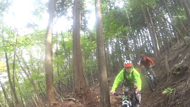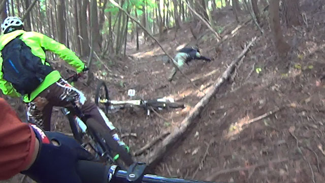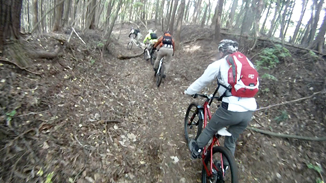 10/22[もう少しで山梨お馴染みチューブトレイル+前回再発見スピードトレイル]のW戦線を5名にて敢行。午前の部:手馴れたはずのチューブ&バーム連続を往く。がしかし先月台風降雨の影響でか落枝・落石がことの外多かった。調子に乗り障害物競争を各位こなすが斜の倒木クリアならず我輩玉砕。そして後追いするかのように数分後にFuku君二等兵が地球に突進。