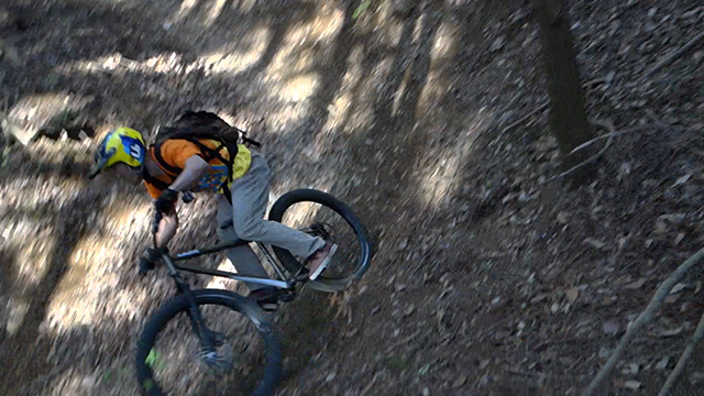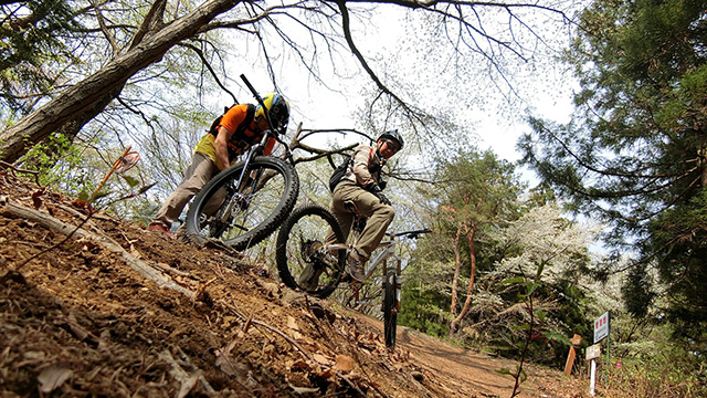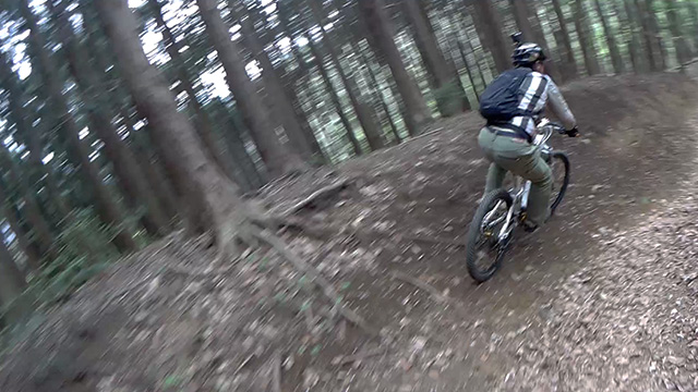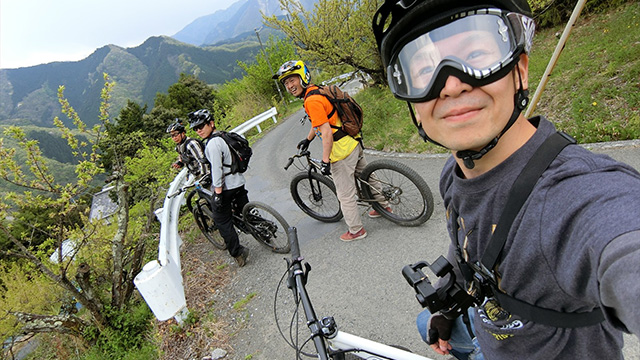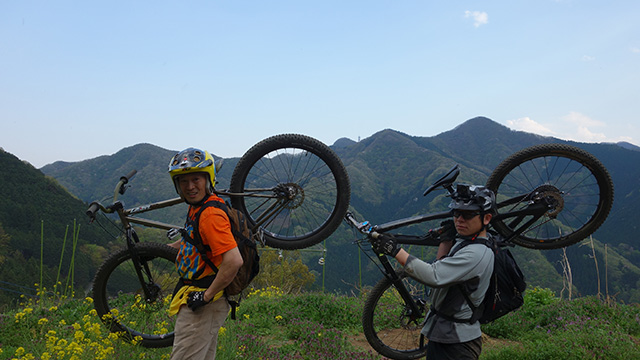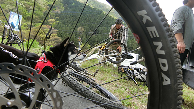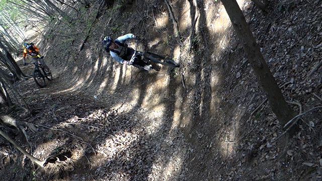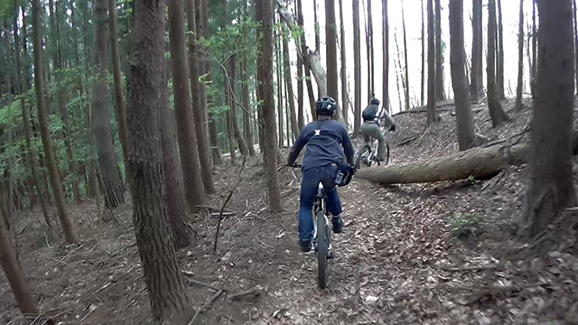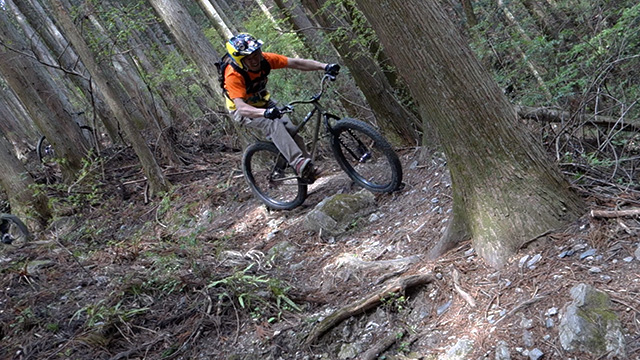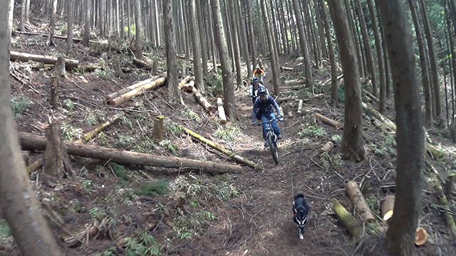 4/29(土)黄金週間初日は春先より探索成就できた快速トレイル披露となる。転居された5年ぶり再会同志AKB君+愛犬HARUさん連れで遠方より賛同頂く。彼はチェストマウントの小型ジンバル装備で登場。その機構は関心ものであった。初盤HARUさん先導で駆けるトレイルではとても爽快に駆けることができた。そして新探索初ルートは想像以上のトライアルDHだったが、難所が続き皆の勇敢?無茶ぶりが非常に愉快であった。午後は3ルートのうち一番の豪速トレイルを往くのだ。