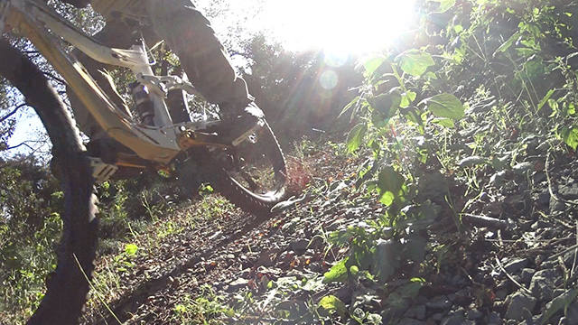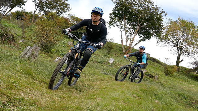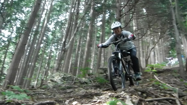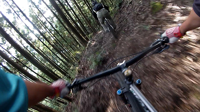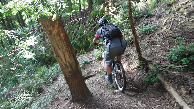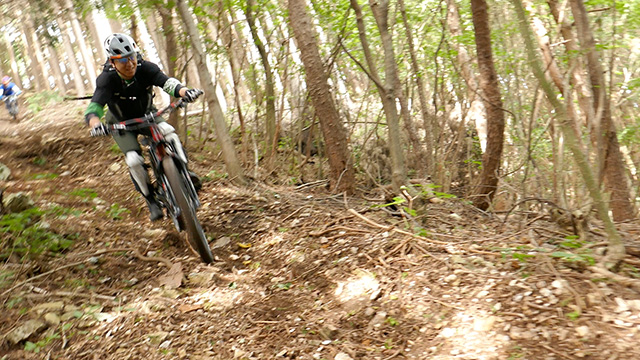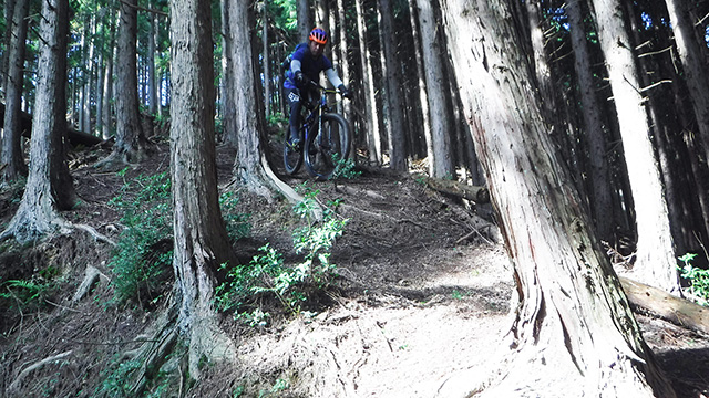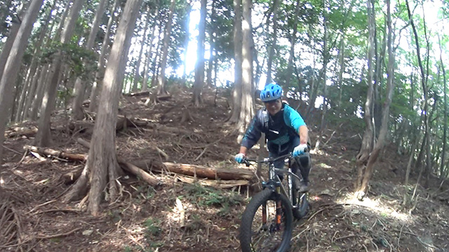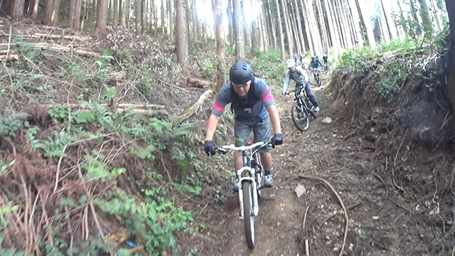 午後の部は西隣の尾根へ移動。第二ルートは間伐完璧な明瞭林間での九十九折ルート。踏みしめる針葉樹の腐葉土はしなやかで心地よく走れる。枝打後なのだろうよくホイル枝噛みしたが、情景はおおらかで信州的雄大さを感じた。後半は岩盤地帯だったが皆体がほぐれ柔軟に難コーナーをクリアして行く。こちらでも誰にも会わず完全貸切であった。そして第三ルートは登り直して同尾根西南地点より降下。粘土質の急降下で慌てながら駆けていく。空が開けエリア最速の防火帯のようである。半ばからは掘割道が続き滑落恐れがないので調子よく飛ばす。がしかし、後進からは歓声途切れ次々に転倒者続出。失敗もなんのその、皆思う存分遊び過ぎ心地よい虚脱感を得れたであろう。