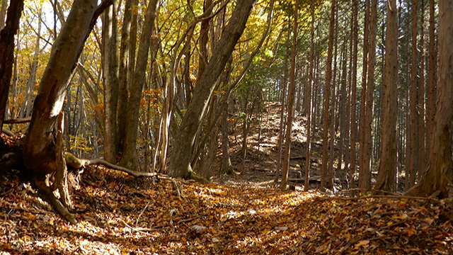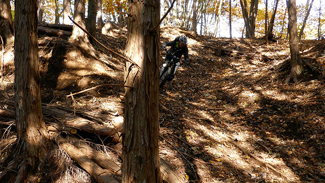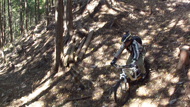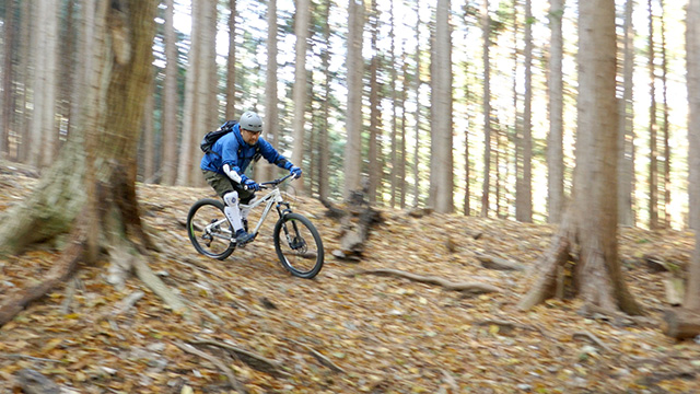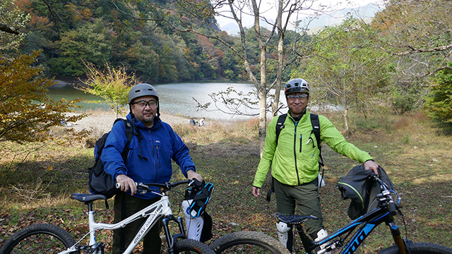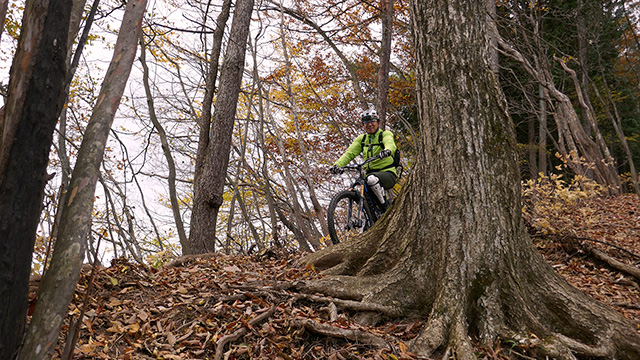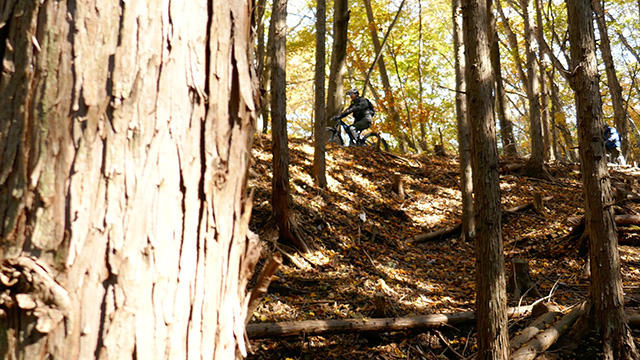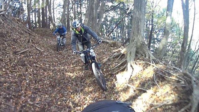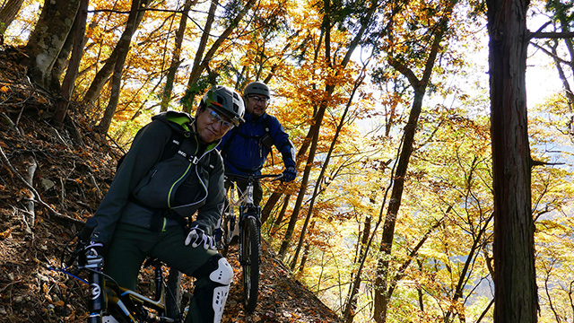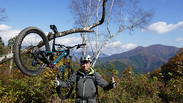 11/4(土)は急遽山行きたい病発症者3名がもう少しで山梨への県境尾根を目指す。穏やかな秋晴れに恵まれたが、麓も既に秋色に染まる。スタート地の標高1100m超えは12度位の爽やかさ。尾根伝いでは鮮やかな色の落葉に埋もれ、また風害での落ち枝が無数にホイールに絡んでくる。