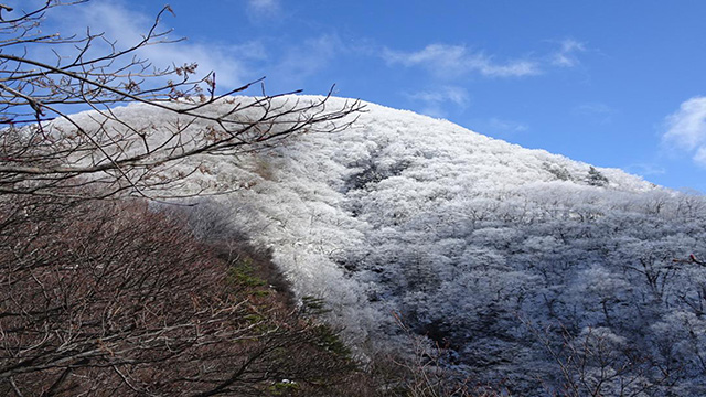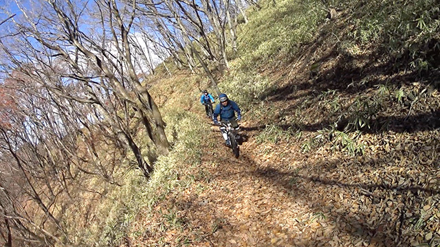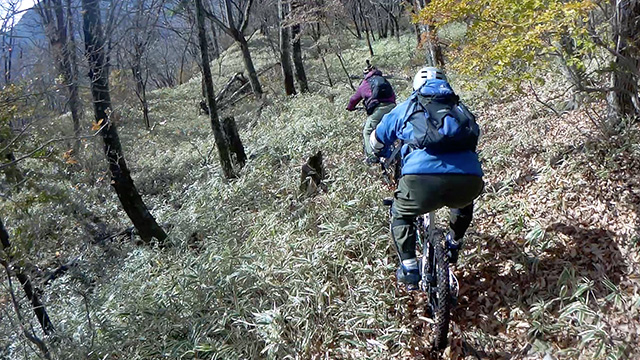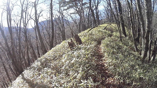 11/12(日)は以前より探索行きを決めた山径を求め上州連山を目指した。当日麓から中盤までは紅葉終盤を迎え、快晴でありながらせっかく登りつめた先の連山最高峰1800m超級頂きは、なんと冠雪にて登頂断念。安全第一にて肩部1400m峠から南西に向かい降下に挑む。以前訪れたことのある笹吹ヤセ尾根は北風が吹きすさび気温も1度位。不安な寒さに耐えるスタートである。しかし進むうち落葉した樹林帯は日照がさんさんと差し明瞭な道筋を照らす。