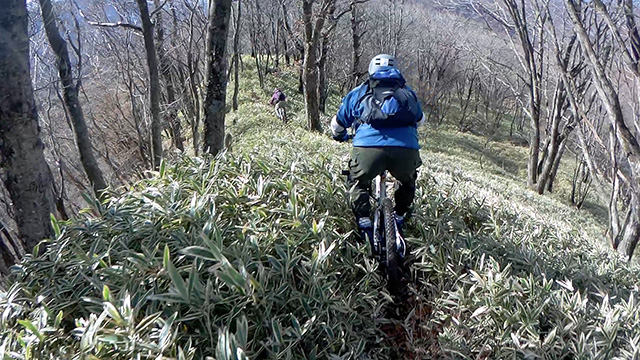 中盤まで知る道筋だが昔辿った谷降分岐を敬遠し尾根上延長を行く。しかし行けば行くほど笹薮が行く手を阻み悔しながら退行にかかる。400m押し上げ戻った西向峠からトラバース降りにかかった。こちらも探索路なのだが地図上には破線もなく不安もあったが、日照が強く明るい路面はしっかり踏み跡を示し巡行がかなう。スタートでの寒さはもうなく温暖な空気に包まれ愉快が続く。軽快な心持のまま15kmの尾根筋亜流の道を探索完了となった。