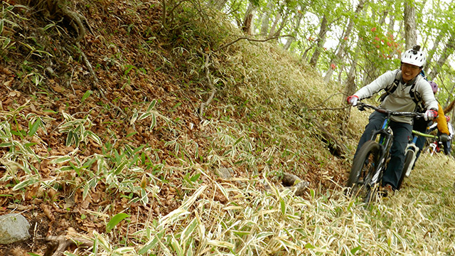 進入した尾根筋は青葉が囲む雄大な道筋である。側にクマ笹が生い茂り視覚的ガードレールに感じるが、そのヤセ尾根の様は左右どちらに転んでも転落必至。そのリスクにも関わらず各位慌てつつ駆け下っていく。スタートからいきなりスリリングなのでいい刺激になったであろう。それ以降は怯むことなく中盤峠からは尾根上を外れ広大な尾根腹をかけ進む。