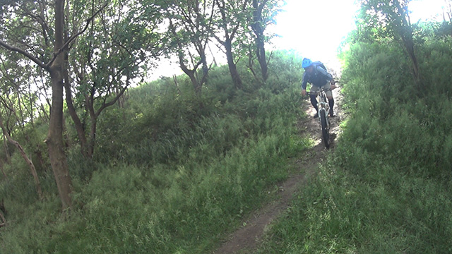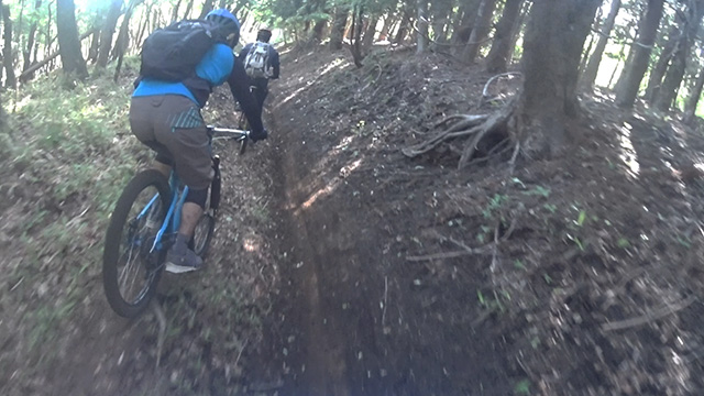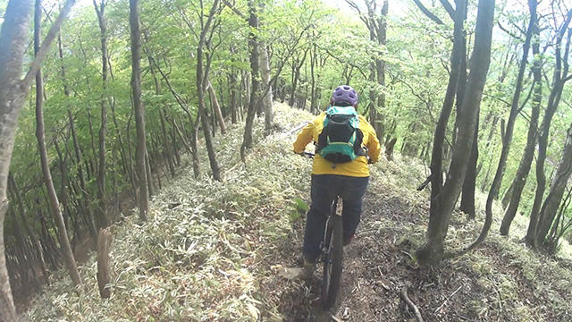 午後は15:00過ぎなのに1400mスタートから再降下。同様ルートで皆目が慣れ足が周り順調に進める。休憩もほぼとらず寡黙に降下する。開始から2/3は午前と同じだが、終盤で別のバリエーションを望み未知の分岐を進む。傾斜は緩いがV時掘れなく直線番長が突進していく。先も知らないのに不安より興奮が優っている。この遠征で快活ルートが確立でき火山トレイル満喫な日であった。