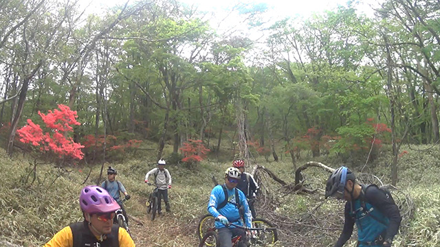 5/20七名が上野国(こうずけのくに)底面約25kmの大型成層火山へ向かった。昨年中頃より山達人様に誘われ以降独自で乗車率高いルートを求めて今回で第4回となった。当日快晴であったが1500m標高は肌寒し。1ヶ月は気温が遅れている。頂部には大小湖を湛えそのカルデラ淵に上がるようさらに担ぎ押し登りでスタート峠に到着。ここからは先の遠大なトレイルを想像し難い鬱蒼とした導入である。