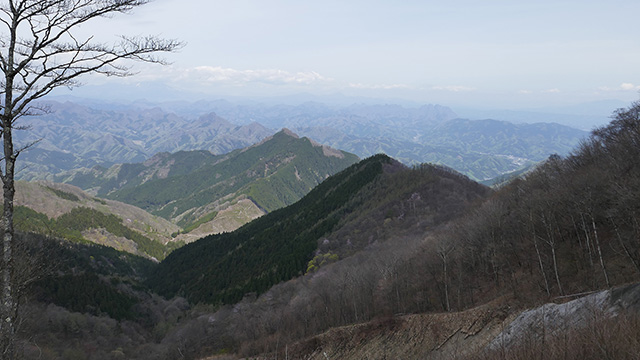 昨4/29は旧来メンバーのみ4名にて西上州の快走尾根を巡る。ここに初めて来た時は広葉樹の緑が豊かで展望など見えず、梅雨の雨後で滑りすぎ楽しめなかったのである。しかし久しく昨秋枯れ尾根に再来すれば見通しがすこぶる良くドライでその豪快さを見直したのだった。さらに西方面の展望絶景を見に寄ったのでのんびりし過ぎたが、大らかな快走同窓会が叶ったのであった。