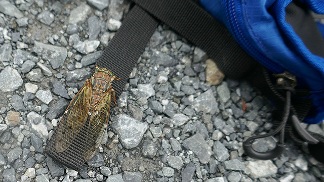 午後は同山頂より北東降りの拠点に移動。空はすっかり晴れわたり下界よりも涼しく昼食休憩を摂る。経路の地質も既にしっかりし軽快に進める。ワンパク諸兄は前半のスピードルートを楽しみ駆ける。枝打ちを跳ね上げ驚きながら進んだ、思えば午前・午後ルートとも皆初走りなのだ。嬉々とした叫びを聞き、初めてのルートではワクワク期待感があって良かろうなぁ、と思えた。諦めずに雨雲逃げ天気待ちをして良かった。