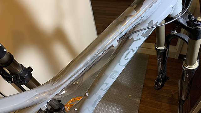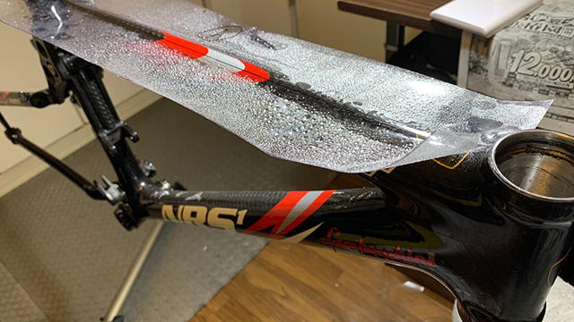 フレーム・プロテクションフィルム施行するため各部サイズ計測。そしてフィルムパーツカット。2台フレームのセミオーバーホール後に洗浄を済ませて施行スタンバイ。これまで何種類かのフィルム製品を利用したが、ハッピークロイツ車用保護フィルムが[しなやかさ・厚み・張込みやすさ・接着具合]がベストである。丸パイプフレームは施行容易だが複雑各部は倍の手間がかかる。