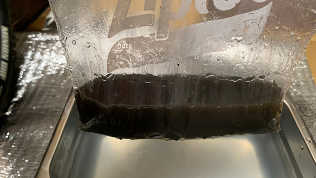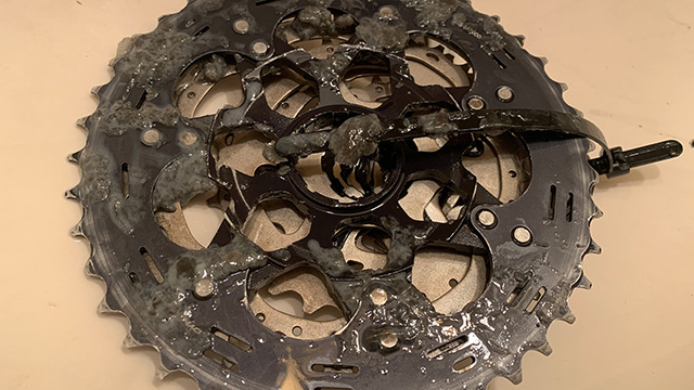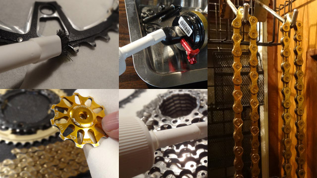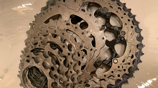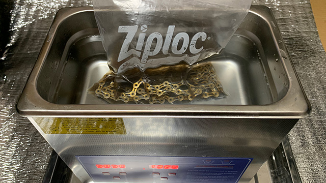 今回の近代化改修は交換部品のコスト圧縮するため手持ちパーツや型落ち新品ホイールなどを用いてアップグレードしていく。よって汚れが特にひどいギア・チェーン周りは12速カセットが収まる洗浄槽サイズで導入した超音波洗浄機[デジタル・ウルトラソニック・クリーナー]でクリーンアップ。さらに油脂とも除去するようにグゥーキンアルファ反応乳化型ハイブリッド洗浄剤入りパック内に浸す。そして超音波洗浄により20分くらい稼働し細部箇所汚物を掻き出すように洗ってくれる。あらかじめ下洗いをした部品だがさらにキレイになる。その効力は原動機ピストンのカーボンまで落とすらしいから凄しなり。