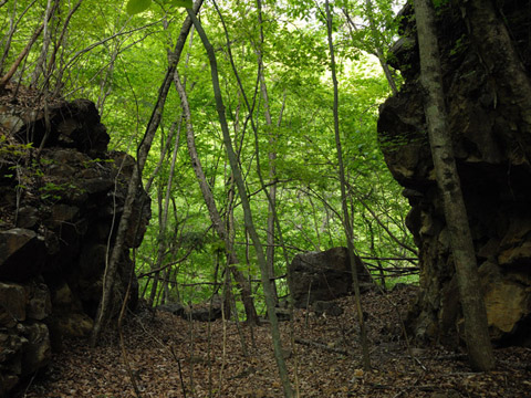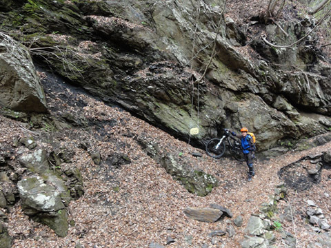 標高920mピークから同域では一番長い5km続く魔境の岩盤巻道を往く。2年ぶりにここを駆けるが延々右端切れ落ちる。その分眺望絶景だが転落なれば一気に30mは落ちる。実際に過去落ちた者のトラウマ恐怖うかべ、SPD装着野郎に注意促す。途中沢崩・大岩盤の脅威はスリル満点。この朽ちた旧道往来した民の苦行を彷彿とするもの。