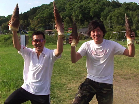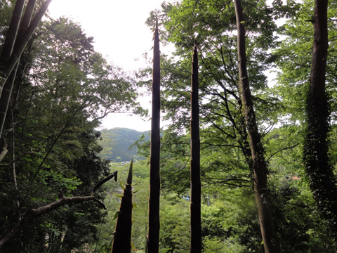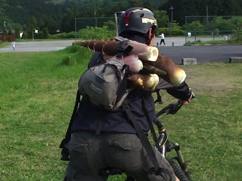 里に降り立っては竹薮に突き進む。そこで最盛期タケノコ群を見つけニンマリ。ココ掘れワンワンで6本の採取に励む。また煮付添えもの山椒も抜き出す。これも少人数ならではの嗜み。晴天のもと収穫に恵まれ山バカは笑い踊るのだった。
