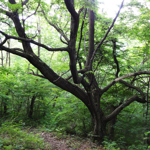 6/12先遣隊7名で奥多摩緩やかな尾根へ。危うい予報はずれ当日は快晴。しかし遅れる寝坊ズ2名との合流時間つぶしのため予定外の主稜逸れた御林山(1087m)へ登り寄る。踏跡少ないその道程は腐葉土厚く、そんなフカフカなオプションの超急降下を騒ぎ楽しむ。先の尾根道では薮が覆いつつ明るさで鮮やかに映る。