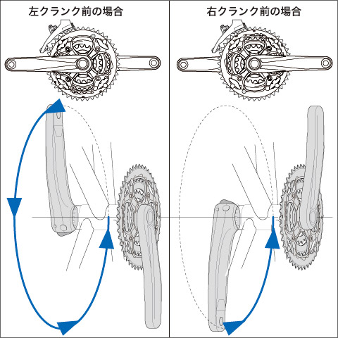 このように上支点側に倒れるとバランスを崩す。難所では倒れる側のクランク下支点にあることでダメージを抑えられる。水平位置は右前保持だけでもダメであり、臨機応変に前出しペダルをシフトしていくこと。要は制動時の車体傾きに応じクランク位置を的確にスイッチするべきということである。