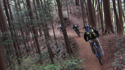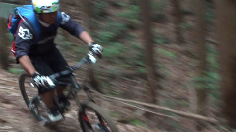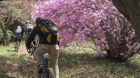 そしてまた再度登頂するが朝より快晴になり、大眺望を仰ぎ山桜や山ツツジが咲きみだれ優雅な昼休みであった。ごちそうを食し午後の高速DHを楽しみにするのだ。前回は遅めの3時発進で林間は暗かったがこの日の2時発進だと道はかなり明るい。激下りが大好きなFUKU氏&KUMA氏の山バカ性能も理解出来たので、ぐいぐい煽りまた引かれて進む。しかし後方ではパンクなどあり休憩となったが、アドレナリン噴出の過剰さも抑えられた。
