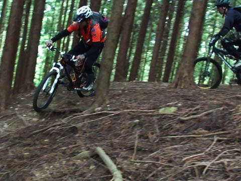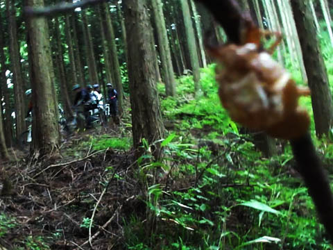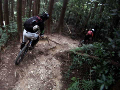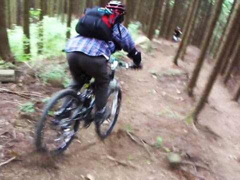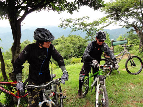 眺望最高のピークは風通しも良好で、思いのほか涼しく登頂できた。皆荒くれ者なので幾つかの古道のうち迷わず上級バカルートを選択。集合遅れもあり時押したので、東方面降下で勇んで進むものの自分含め先行2名がすぐさま前転大破。慣れた道なのでプロテクターを外し調子に乗ってまんまと逝ってしまう...。後進に危険なアタックだよと示しを見せたのだった。