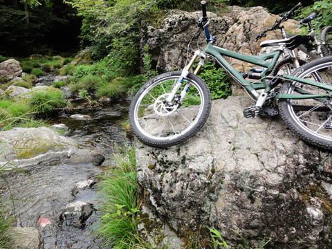 以降は各位悪い見本ラインを避けアタック激降下をクリアする。梅雨前以来もっとも薮丈が伸び大谷トラバースも薮囲いのように成っていた。難関の高速コーナーでアウトしたり小岩に乗り上げたり、皆奮闘していたがどうにかクリアできていた。