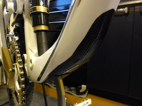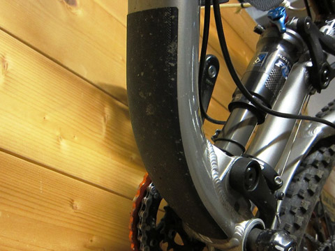 MTBダメージにまつわるフォーラムやコミュニティ参加の方々にも上記の様に既製フェンダーを改造し、またカーブ形状を合わせ涙ぐましい苦労をしている。当方は偽カーボンシートとラバーフォームを合わせしばらく運用してみることに。我らは過酷シーンで愛車を扱うのが当然なのだが、少しでも工夫してダメージを恐れずトレイルランを楽しみたいものである。