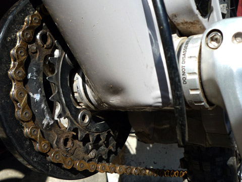 実際の岩場・砂利道など疾走し「カコーン」と響く音は聞くに耐えず、確実にダメージを与えている。いくら丁寧に駆けても跳ね返り石を防ぐのは容易ではない。それを防ぐガードがエントリーモデルに装着されない理由は?それはもう悪路で壊してもらって新たに買わせるメーカー側の販売戦略であろう。