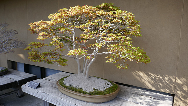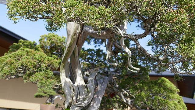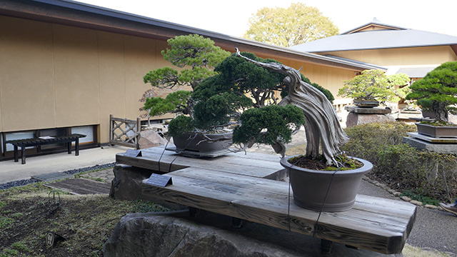 実際に盆栽美術館の展示物に触れると「職人の高い技術による芸術性」に驚きどおし。盆栽とは本来は大木になる種を鉢に収めること。そして迫力ある大樹を再現するが命題であるという。名作を見る機会はなかったので存在感がある数々の名品を見るうちに「力強い根張り・生き生きとした幹の立ちかた・繊細な枝ぶり」などの世界観に心打たれた。
