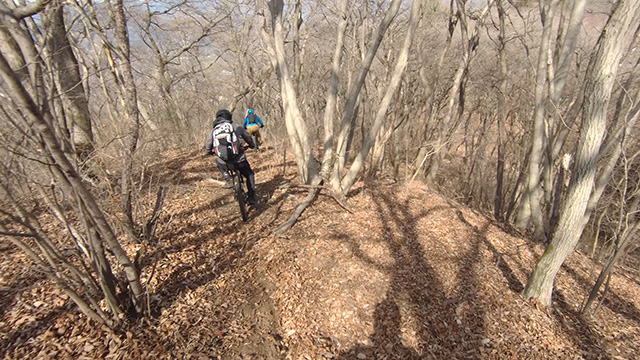 午後は当日目的を果たす長大境界尾根に移動。温暖になり勇んで進むが乗れるところは相変わらず素晴らしい。標高1000mも無いのに高山の雰囲気が漂いやる気にさせる。久々登場のD氏は果敢にトラック飛び系通いをされていたが、当日は新鋭フルサス号が駆けるに相応しい荒々しさを堪能してもらう。岩稜通過で巻道を伝うが前回右回りよりも地崩れが酷くライン選択ミスとなる。それ以降は高速道路の渋滞解放時のごとくドカドカ休まず難所も突破。探索宿題の終盤の深い森にも進むがいく手の倒木地獄を見て恐れ回避のバリエーションを進み終えるのだった。