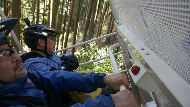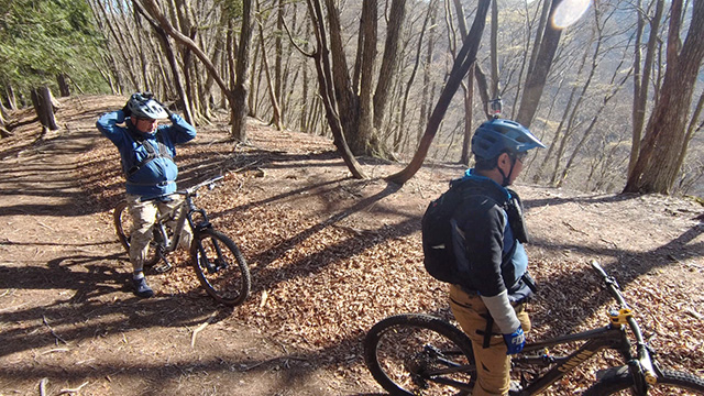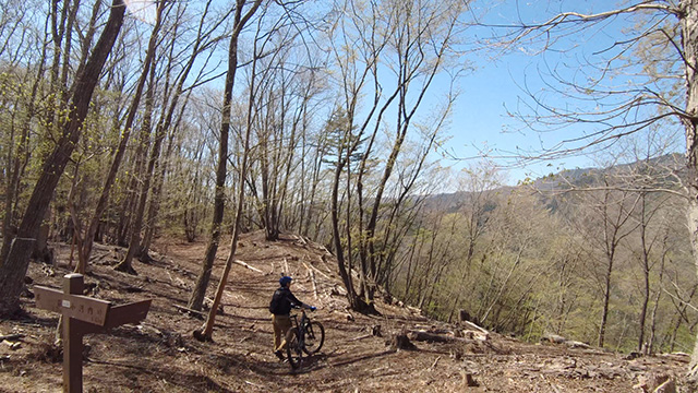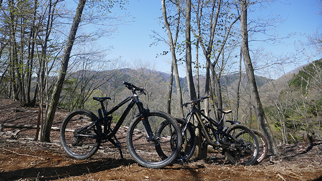 4/9抜けるような青空を仰ぎ久々のもうすぐ山梨至近のビッグマウンテンを目指す。五合目までは新たなるモノレールを利用。4年前は5人乗り形式だったが新機種は9人乗りになっていた。ようやく上り詰めるピーク部からは石尾根のような広大防火帯を駆け下りていく。霜がはりつめ滑って驚いたり慌てたり愉快な滑降であった。目指す方向へ折れる峠からは順調にかけた、はずが間も無く大胆なオフキャンバー地帯に張り付きながら進む。昔最初に訪れた時はこんなに崩れてはなくコーナー先はただの壁のごとく道が見えなかった。やがて開けた鞍部に出てくると途端に雄大な景色が広がる。10年前は初夏に訪れ緑深く鬱蒼としていたが葉のなき広葉樹林では大眺望までよく見渡せた。